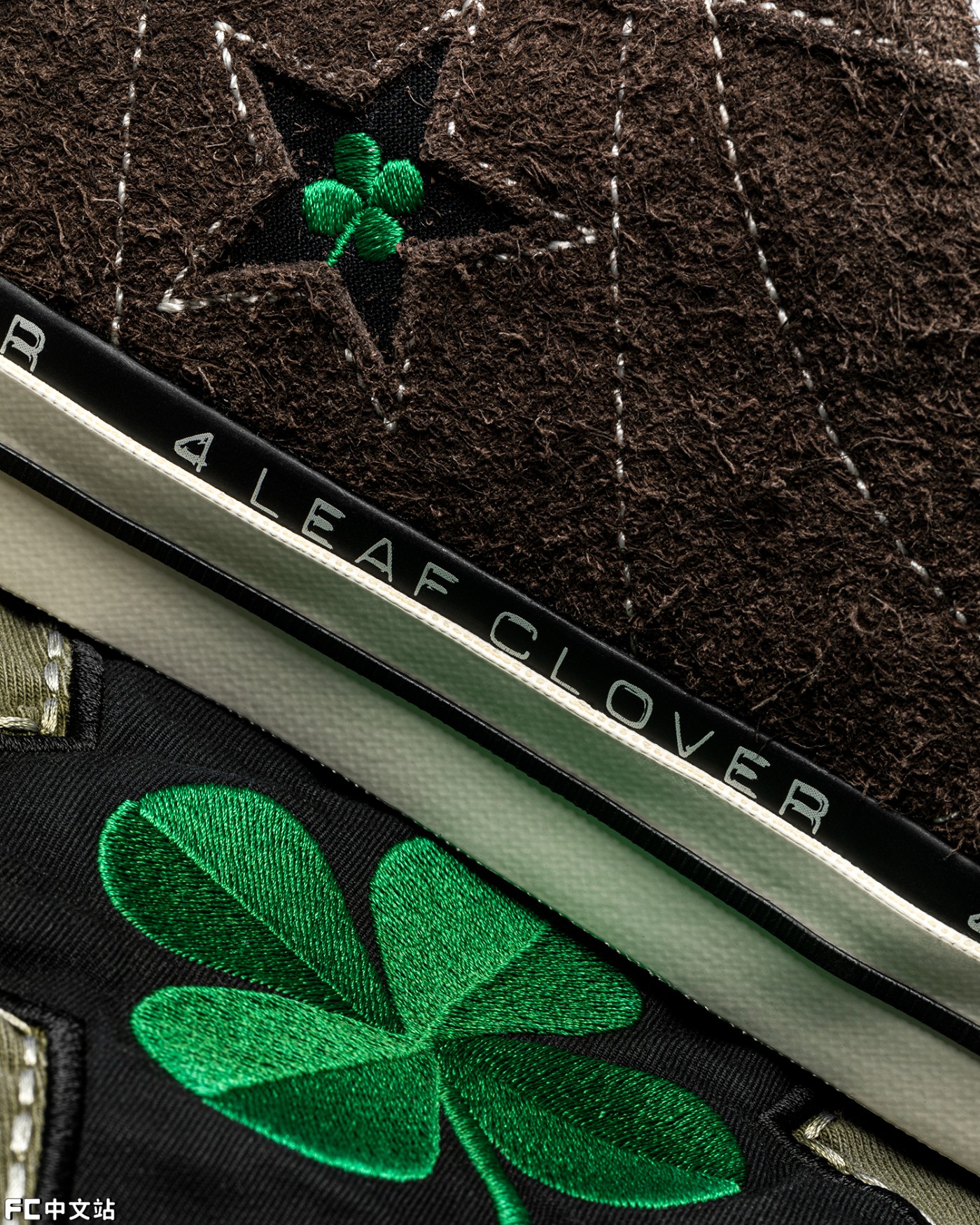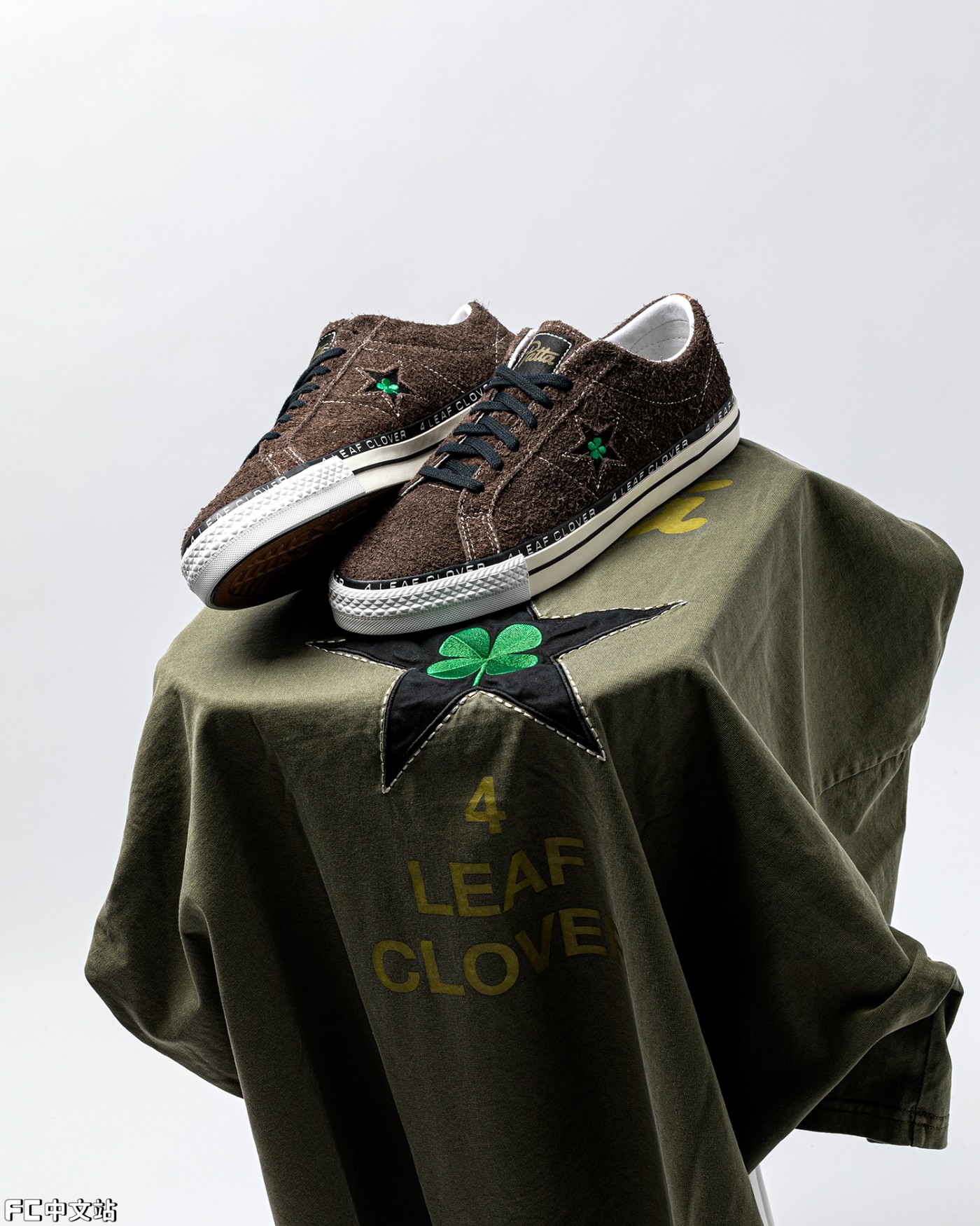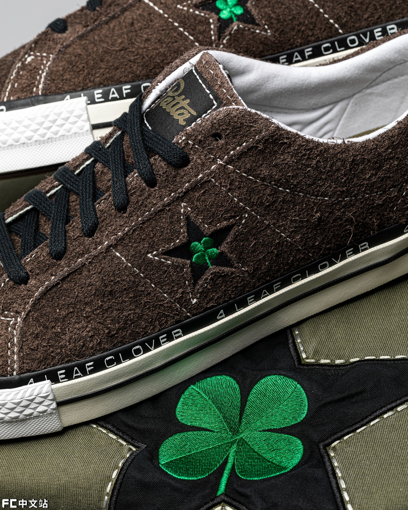 侧身「One Star 」Logo 以黑色呈现,并在当中妆点了鲜艳的绿色「四叶草」刺绣,点明本次联名主题,同时为鞋款增添一抹吸睛属性。
