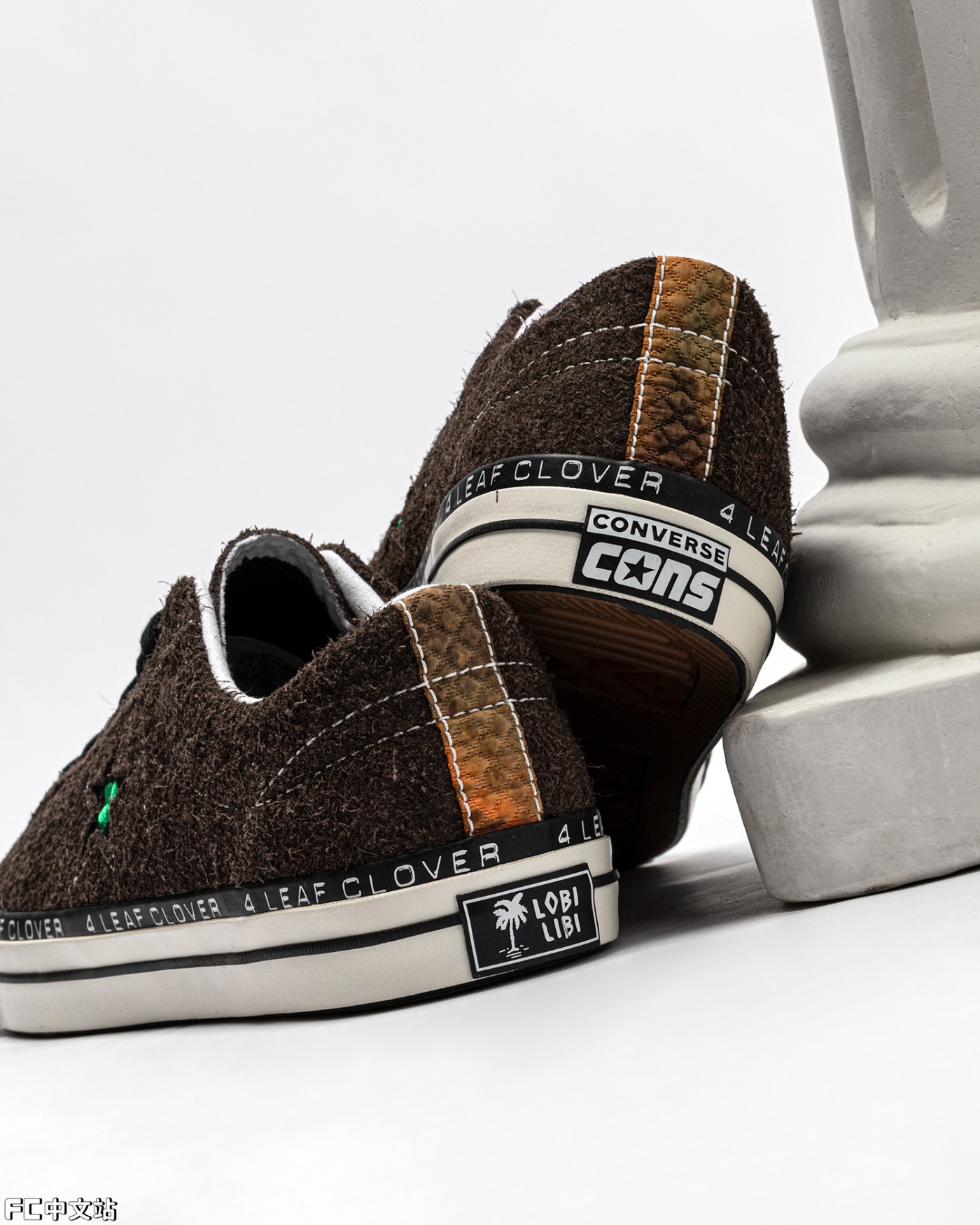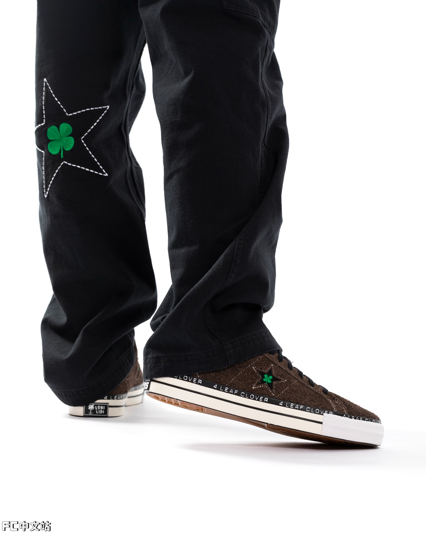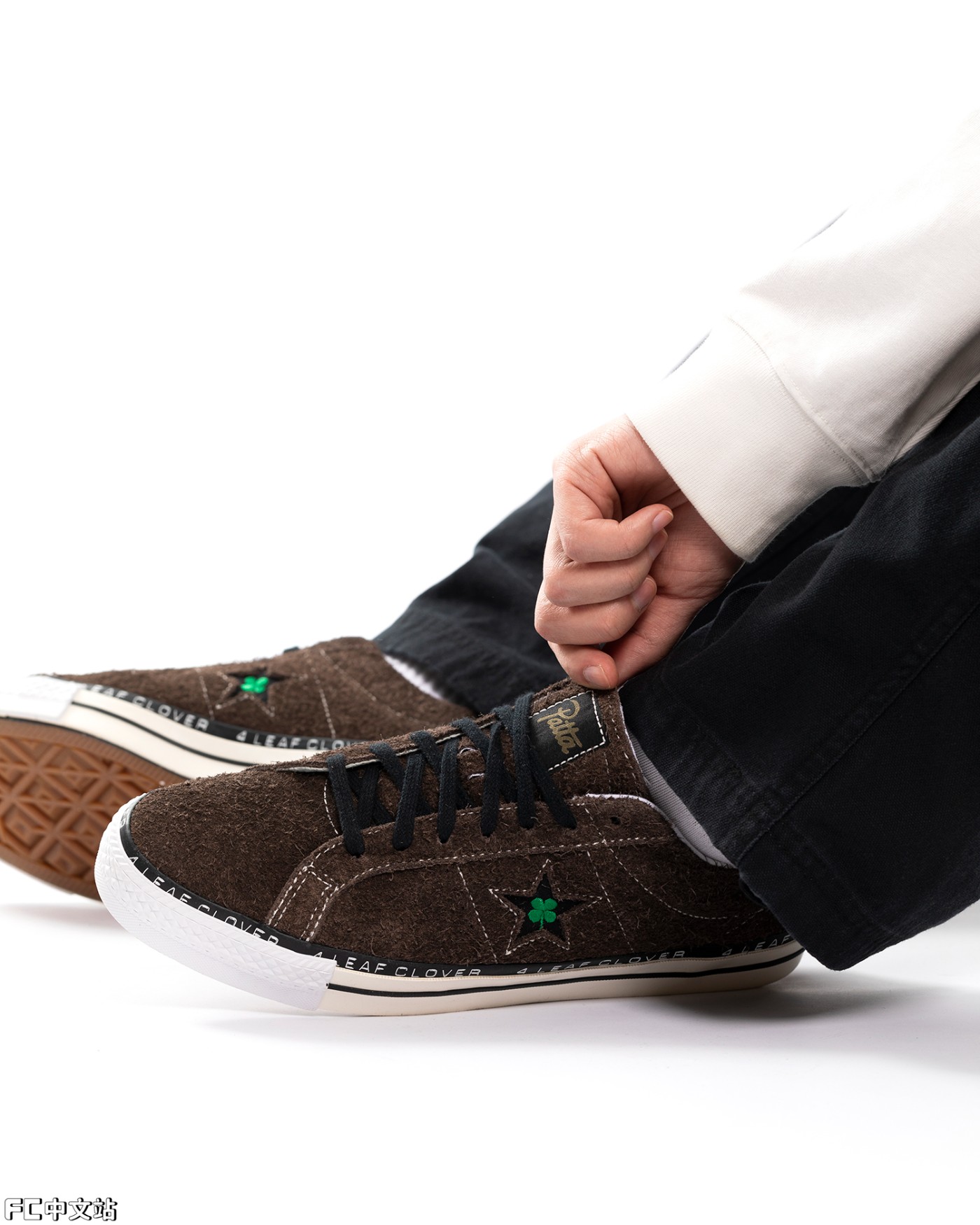 侧身「One Star 」Logo 以黑色呈现,并在当中妆点了鲜艳的绿色「四叶草」刺绣,点明本次联名主题,同时为鞋款增添一抹吸睛属性。