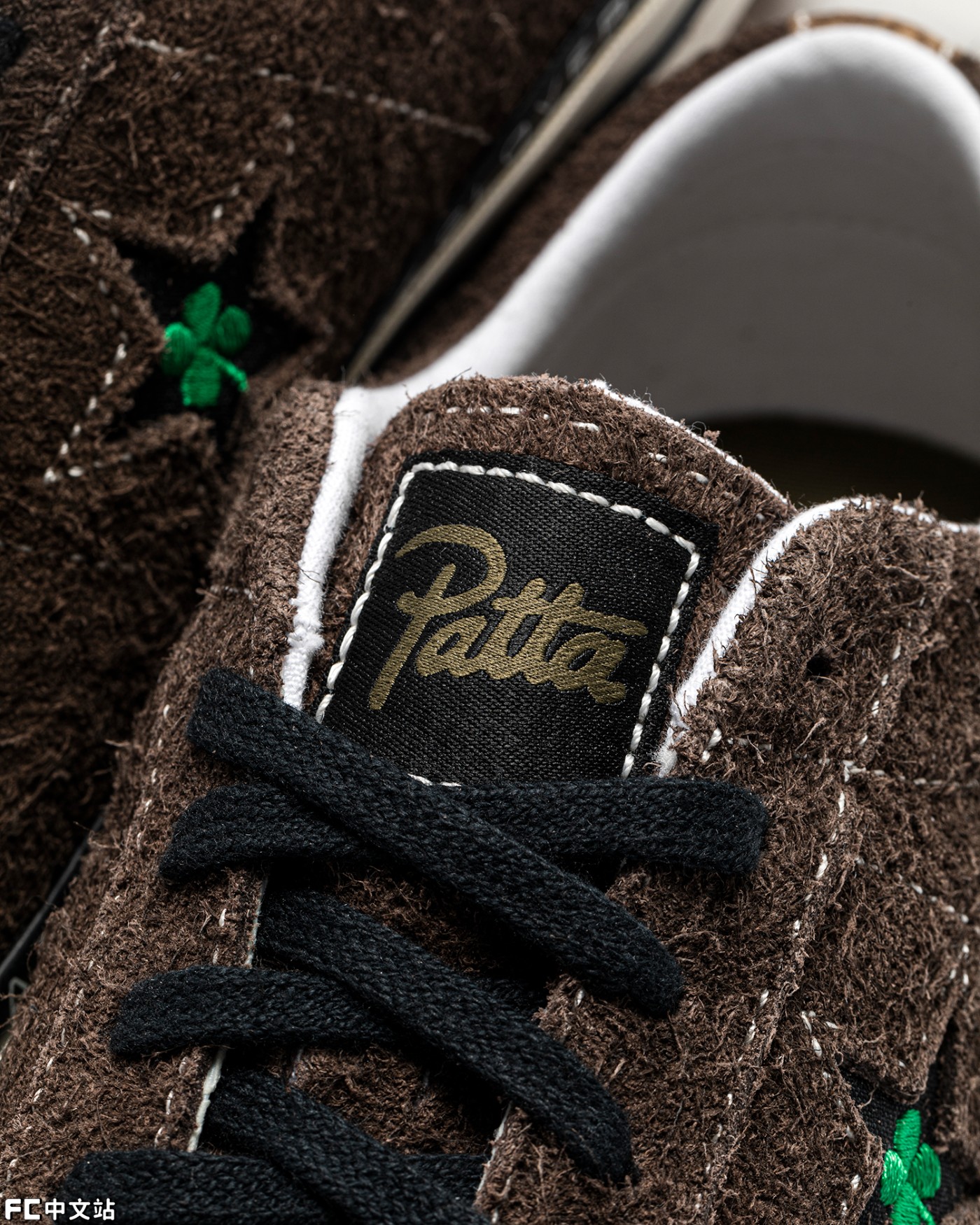 鞋舌标签将原本 Converse Logo,改为了棕色「Patta」字样,将联名身份彰显。