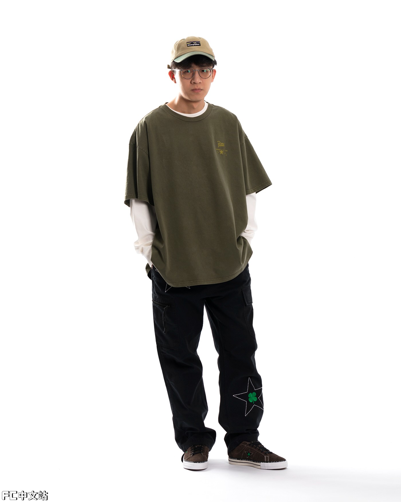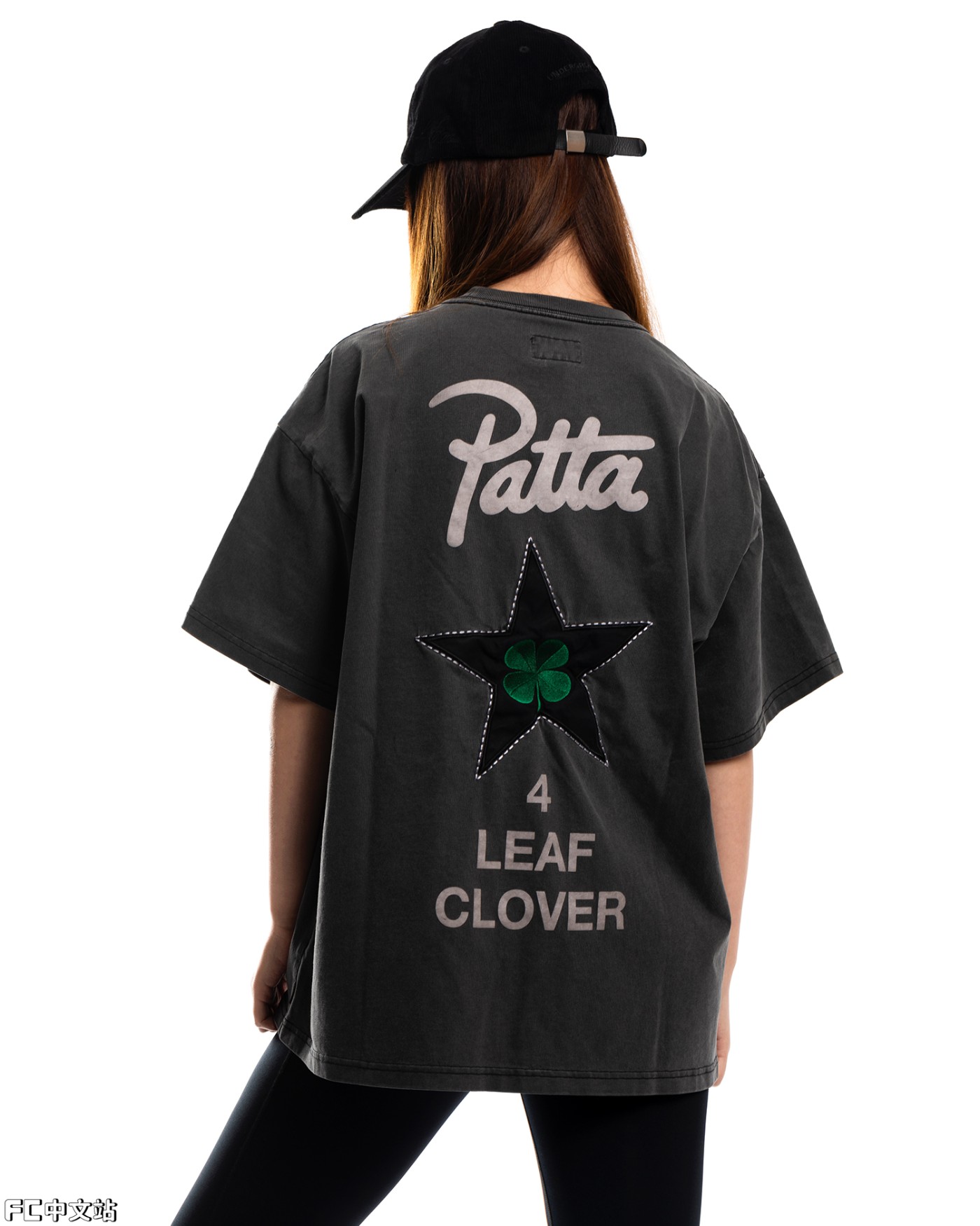 短袖共分为两种颜色,分别是水洗灰色和军绿色,搭配上背面丝网印刷星星贴片和刺绣幸运草图案,整体造型格外醒目。