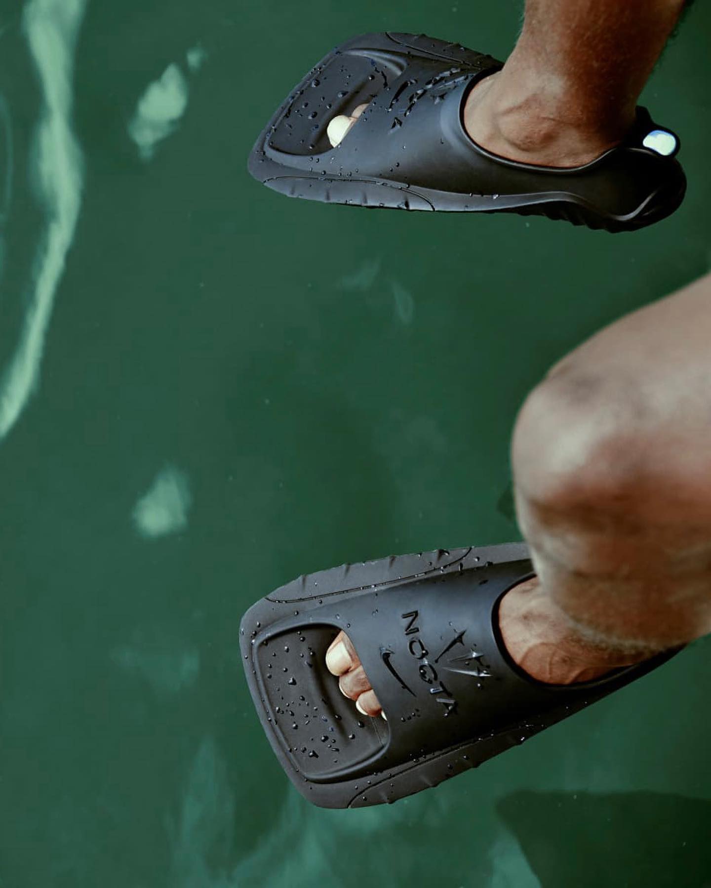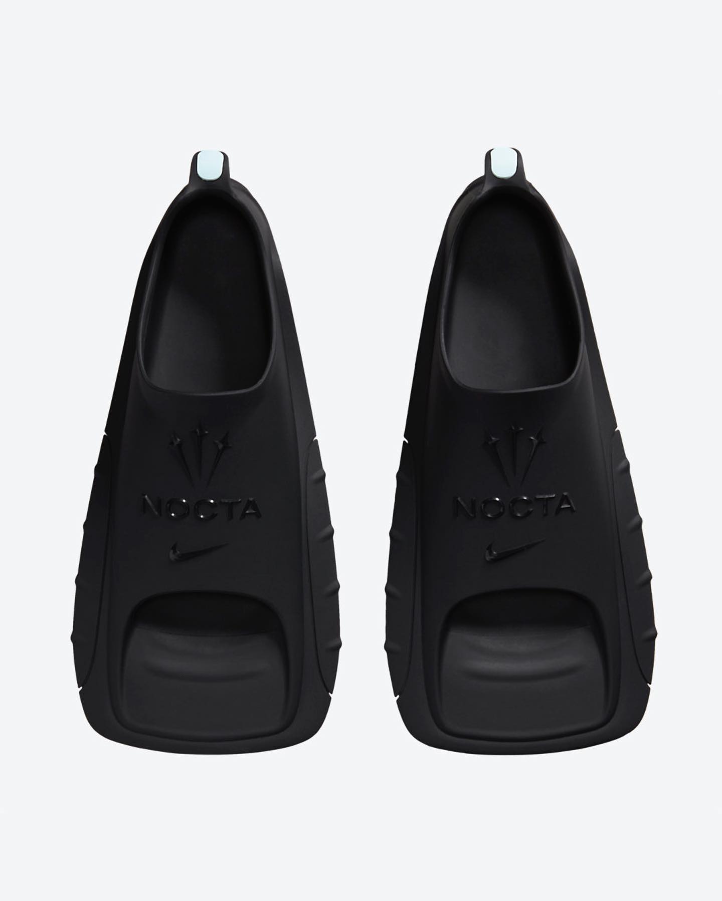整双鞋作为一双潜水使用的脚蹼,鞋型上模拟了鸭掌的造型,鞋面从上到下分别是三剑 Logo、NOCTA 字样以及 Nike swoosh,低调彰显鞋款身份。
