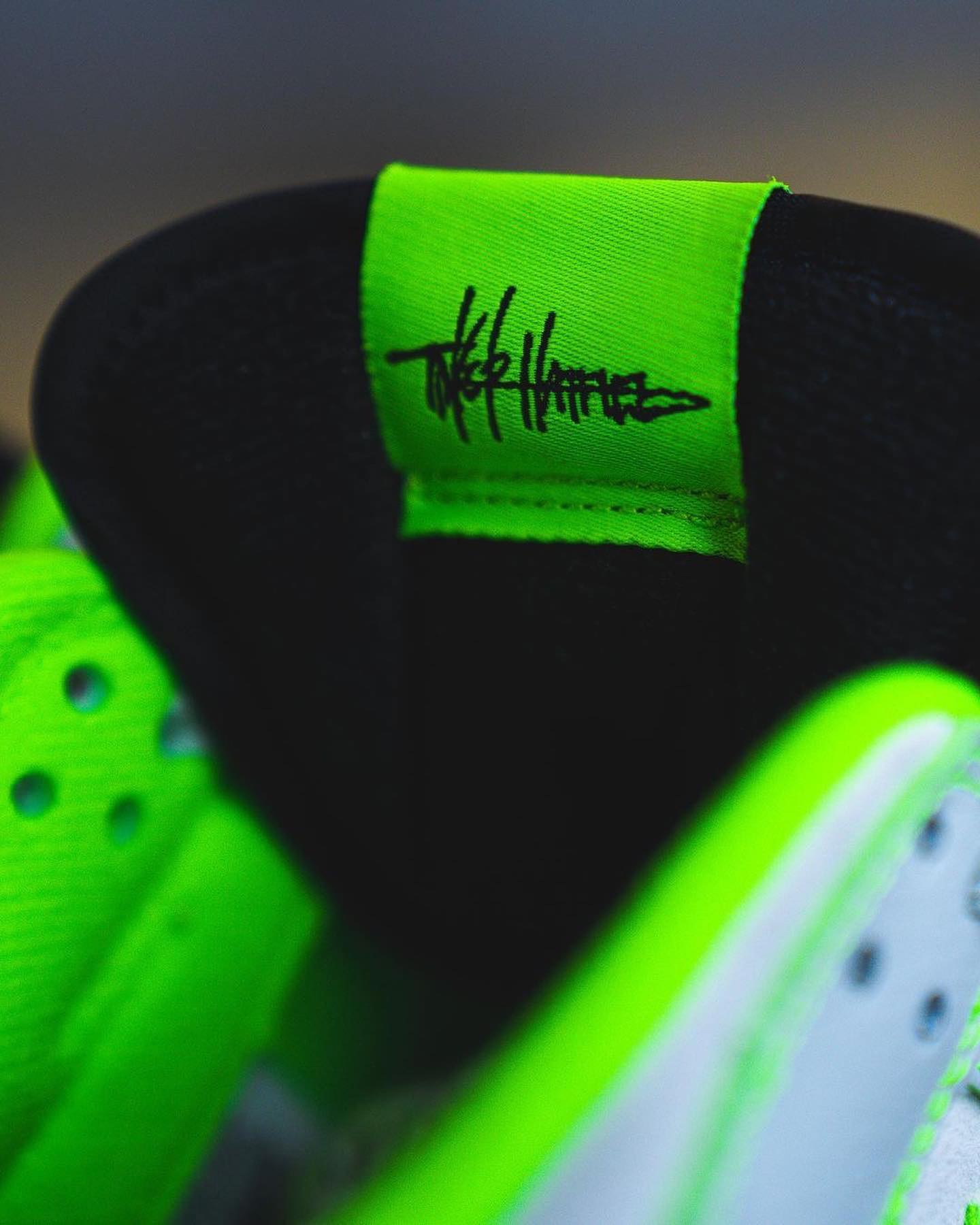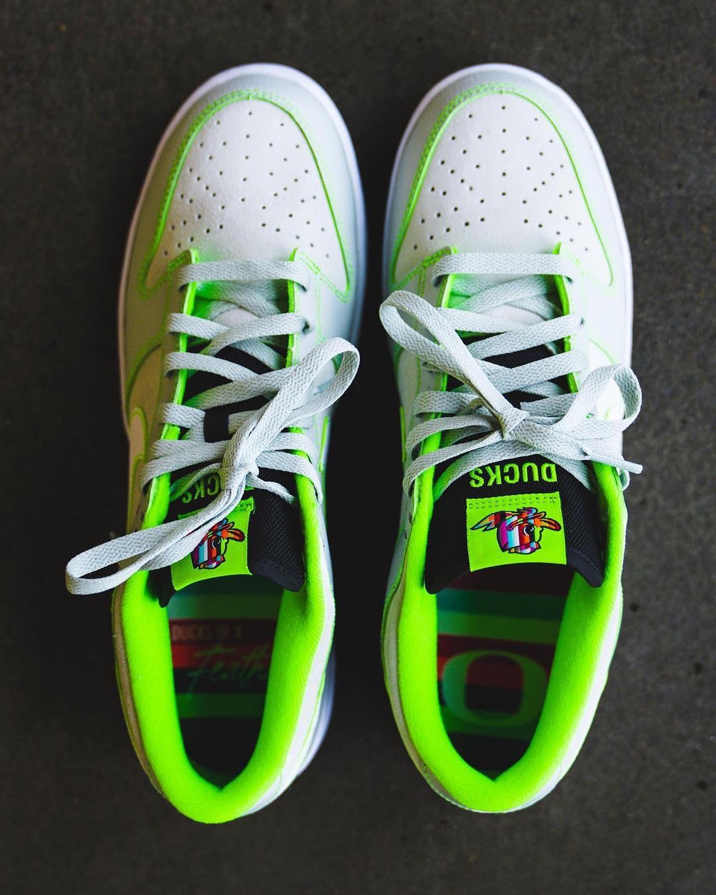 整双鞋采用灰色妆点,荧光绿色勾勒,还原「俄勒冈」配色方案。