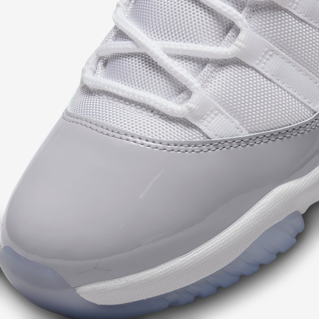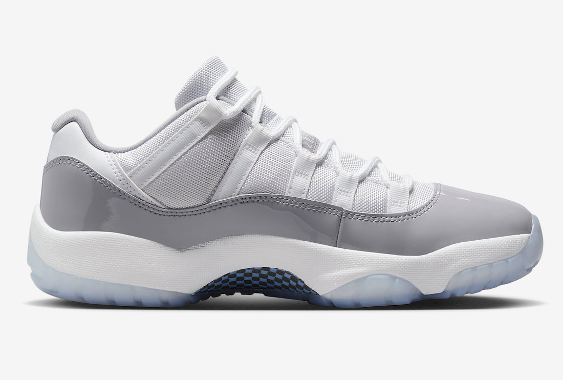 鞋身依旧采用熟悉的漆皮与尼龙织物共同呈现,相较于 2018 年推出的「酷灰」Air Jordan 11 Low,本次「白水泥」漆皮部分颜色更浅。