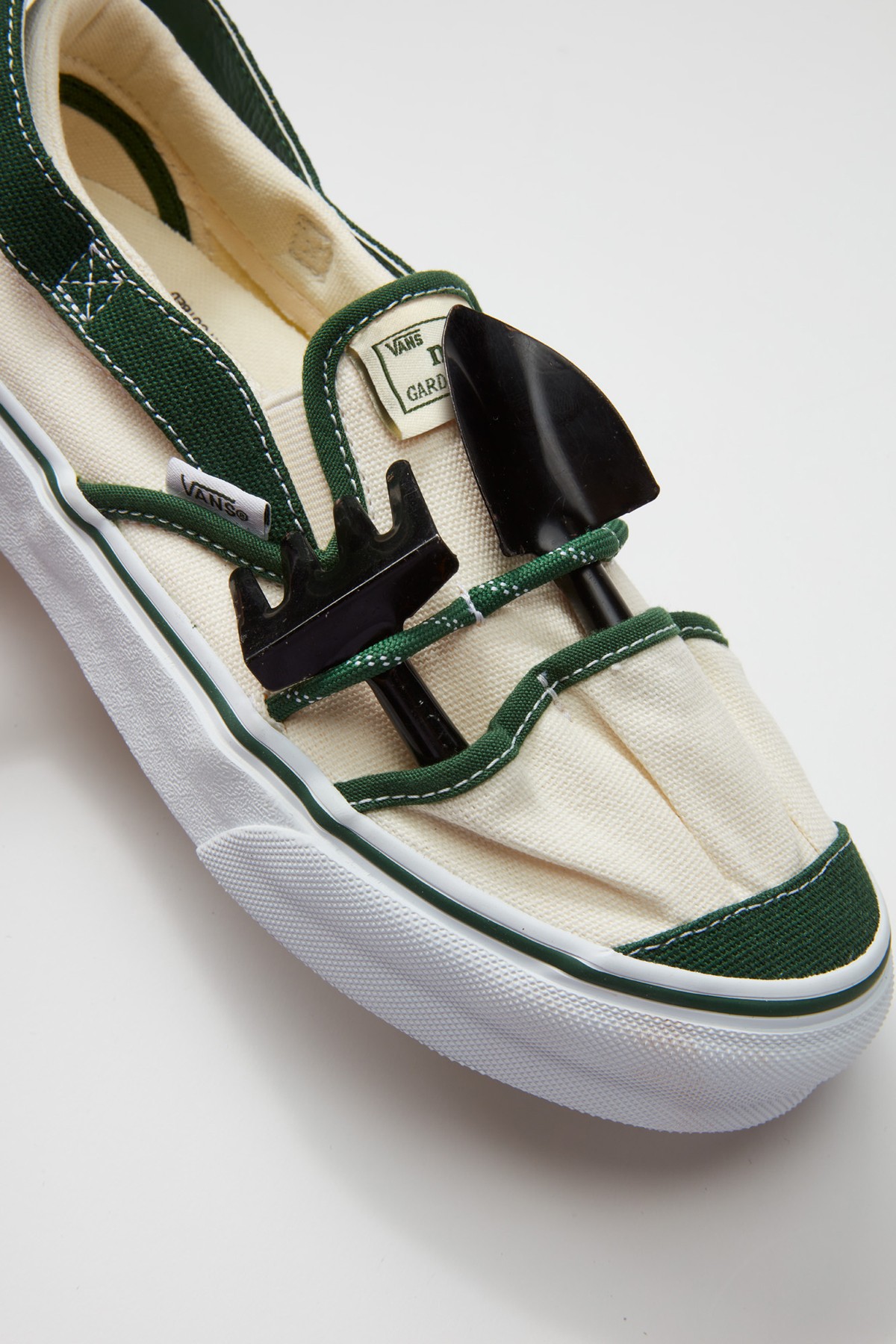 此次联名以经典的 Vans Slip-On 为蓝本,米色、绿色组成的鞋身,视觉效果格外清新、简约。