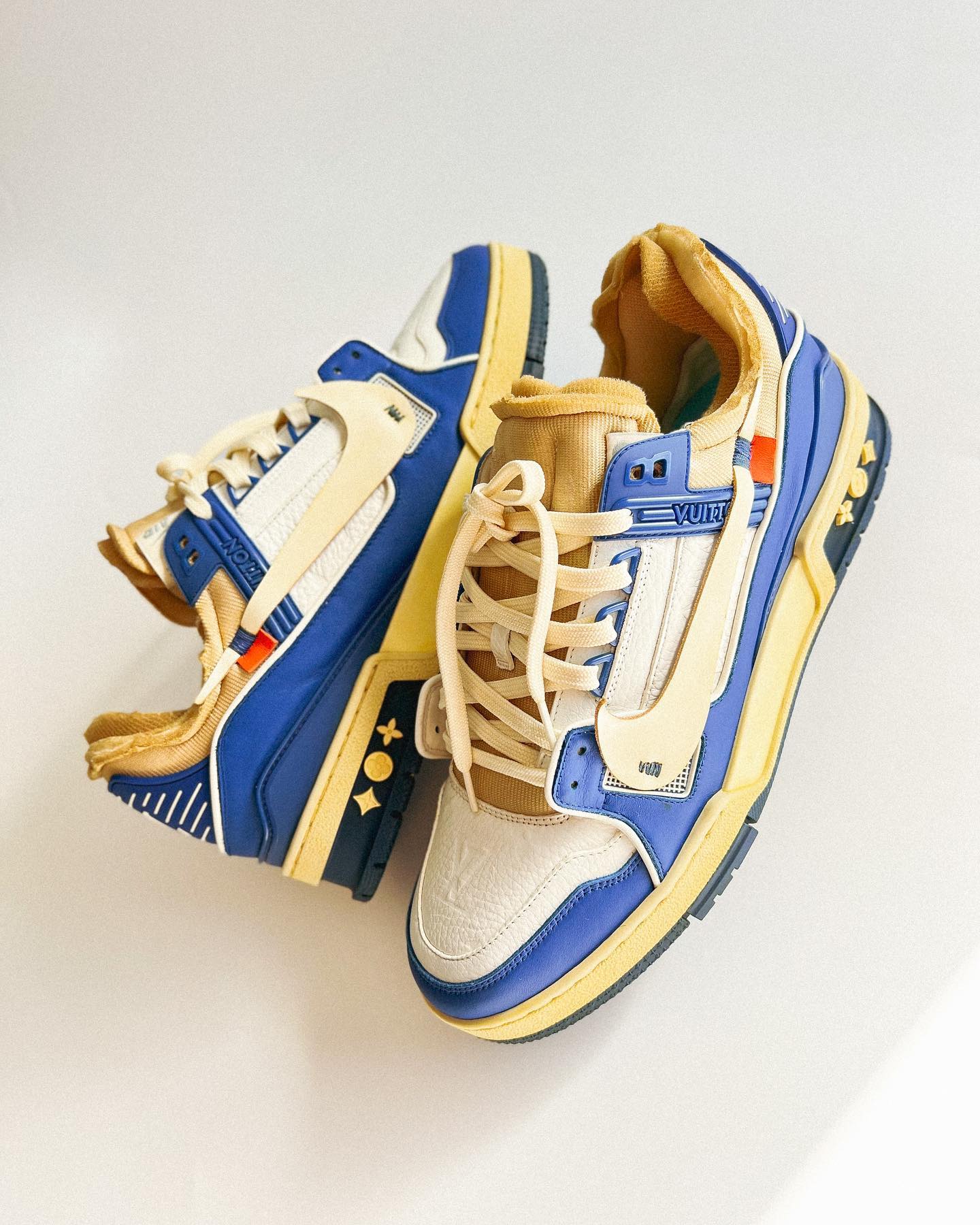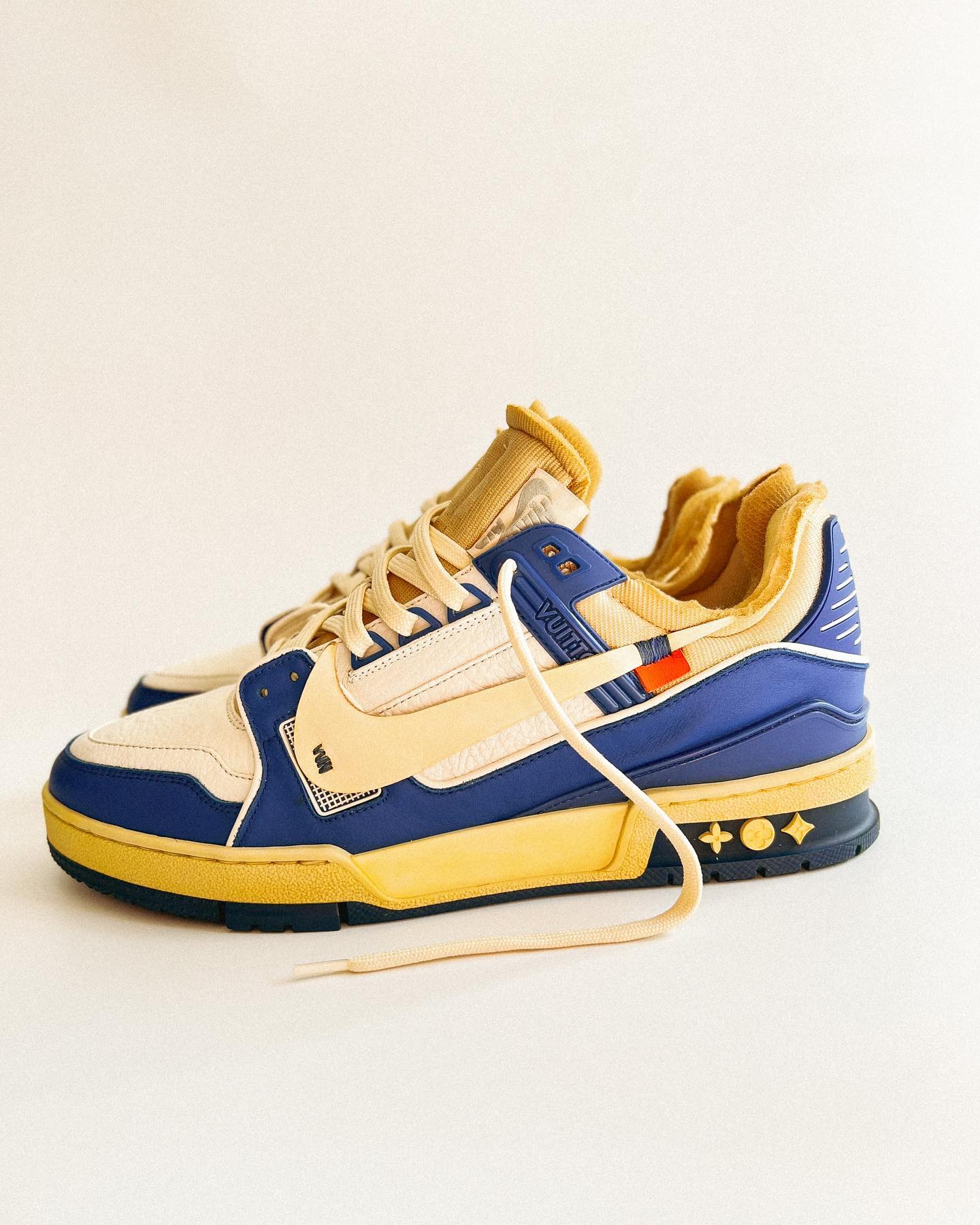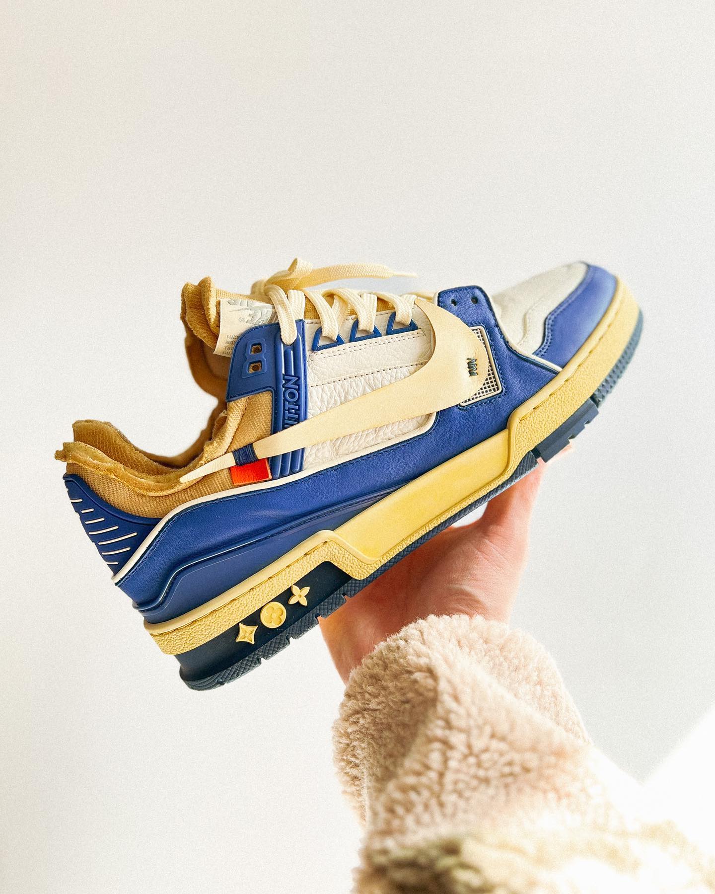 整双鞋以 LV Tranier 为蓝本设计,采用蓝色和米色点缀,复古气质十足。