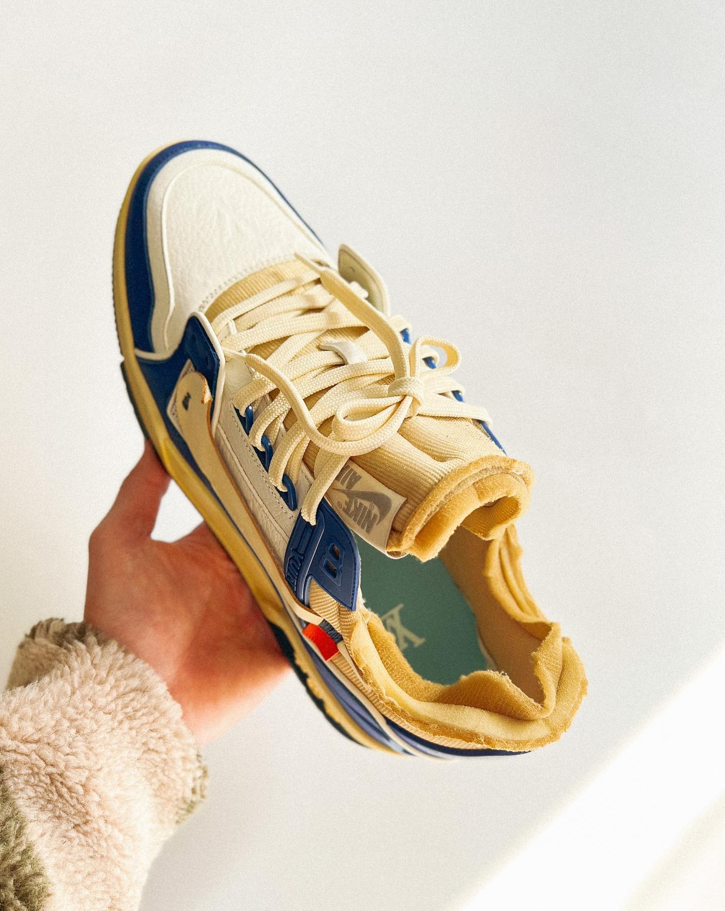 Huy Le 作为海外最火的球鞋定制师之一,一直以复古做旧为设计灵感。之前设计的客制版 Air Jordan 1 获得众多球鞋爱好者的追捧,NBA 球星詹姆斯更是亲自上脚并晒图。