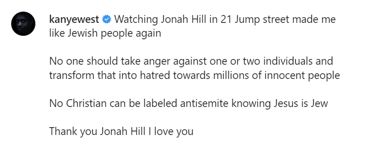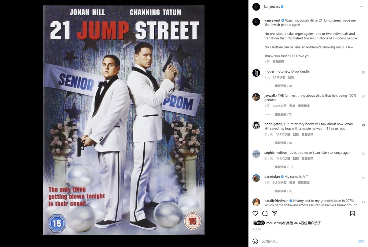 但在这条动态中,侃爷并非是对该电影做出评价, 而是表达了对于主演 Jonah Hill 的喜爱,甚至称因为他让自己再度喜欢上了犹太人。