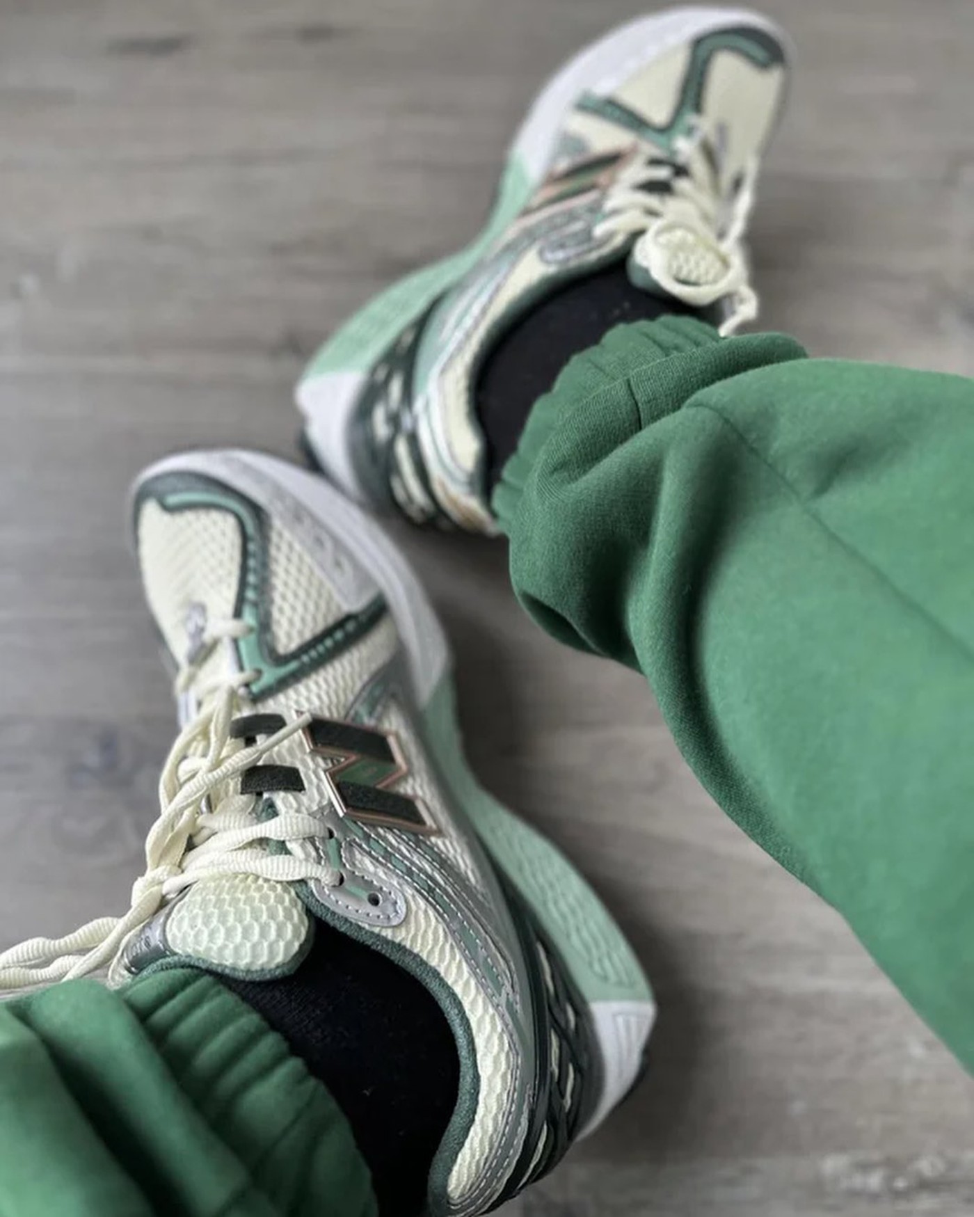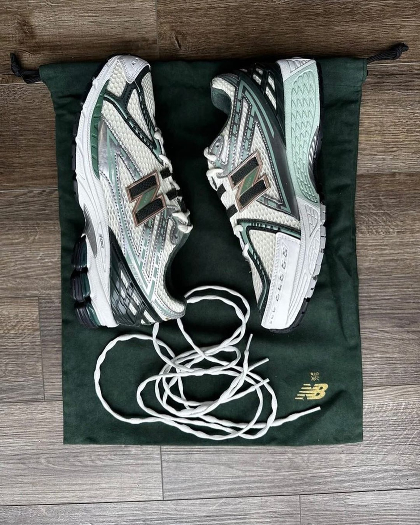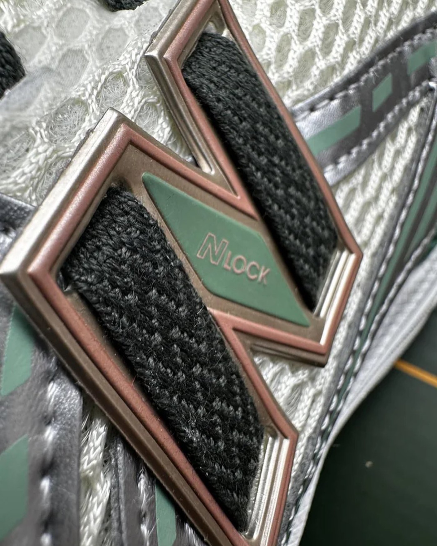 整双鞋以大面积白色为主调,辅以电镀银和绿色细节,视觉效果依旧十分简约,却又不失高级。