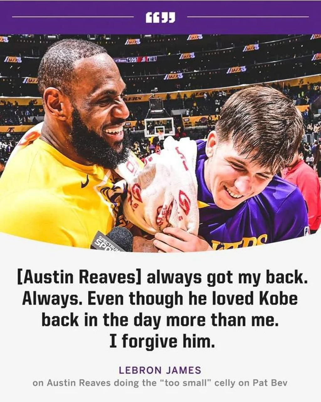 赛后詹姆斯接受采访时一边大笑一边说到:“感谢里夫斯,虽然他以前是个科蜜,并不喜欢我,但我已经原谅他了,哈哈”