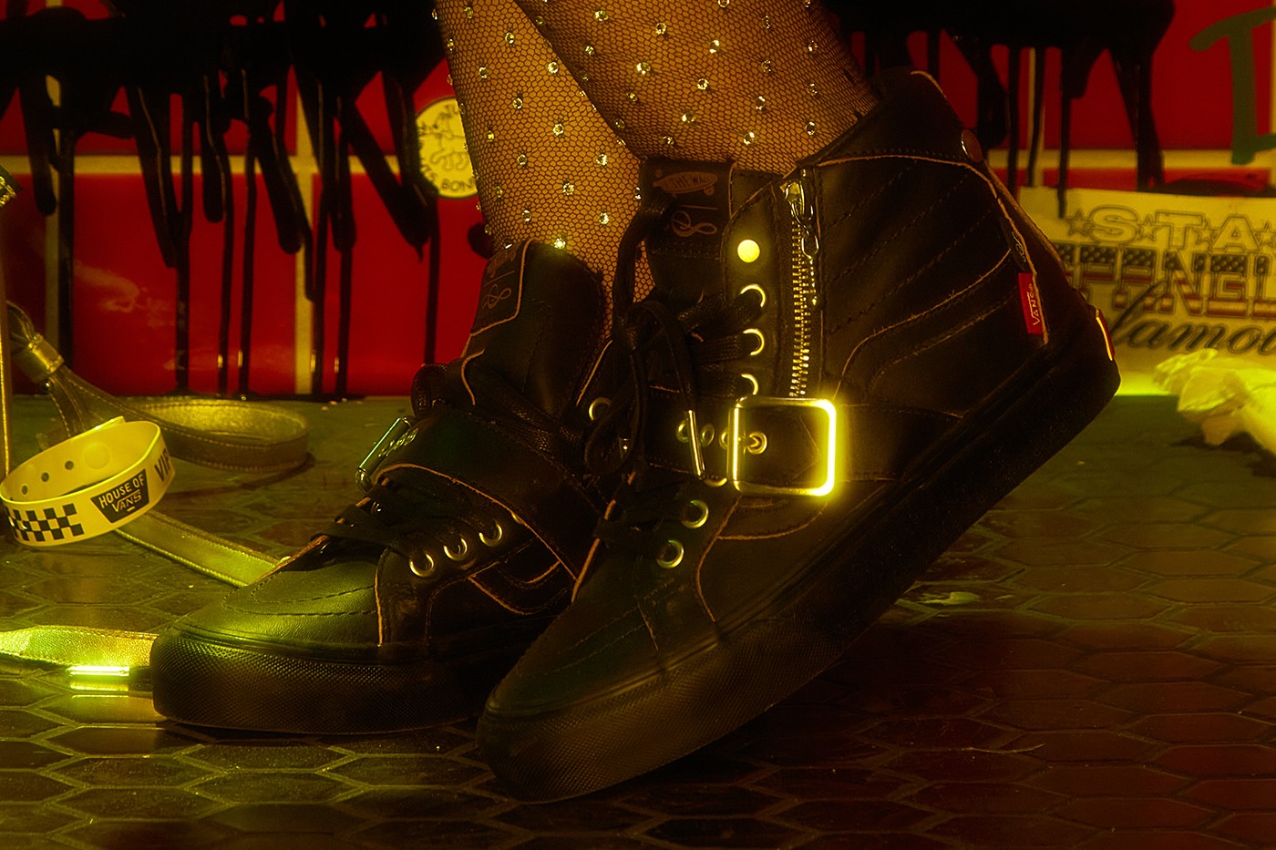 第三双 Sk8-Hi Reissue Strap VLT LX 的灵感同样来源于皮衣,棕色的线条勾勒鞋身,皮带设计一眼看上去就有着浓烈的摇滚氛围。