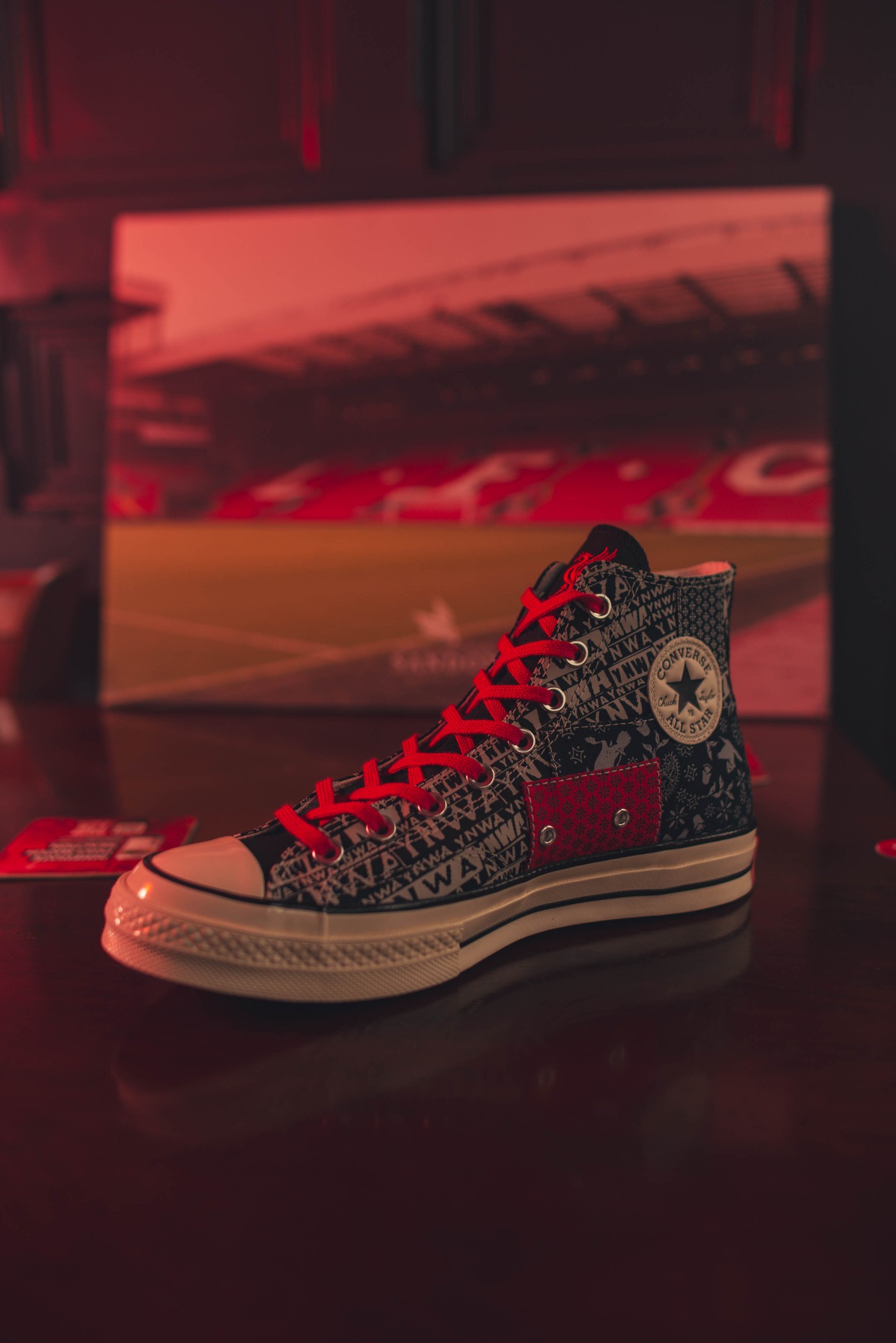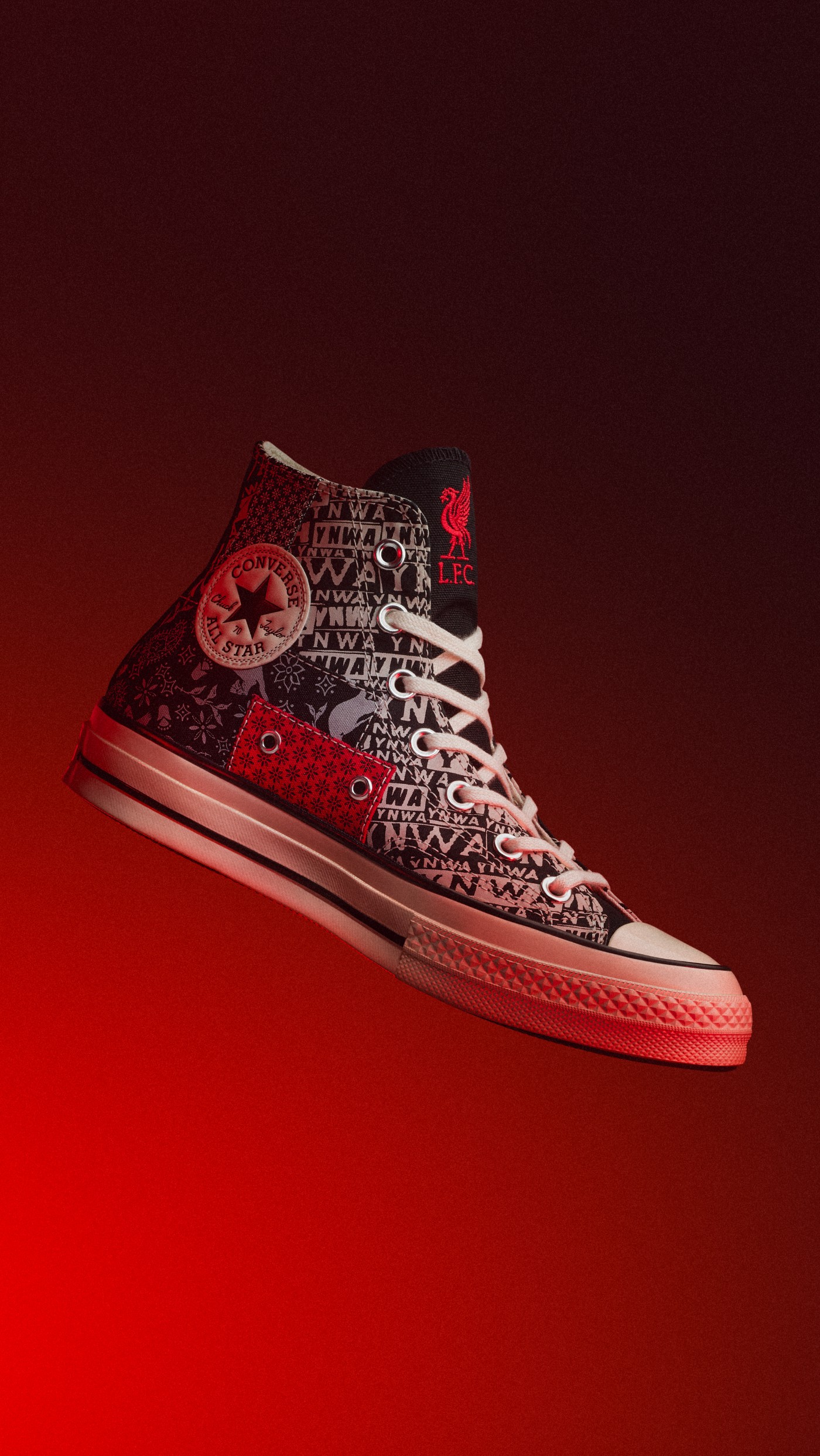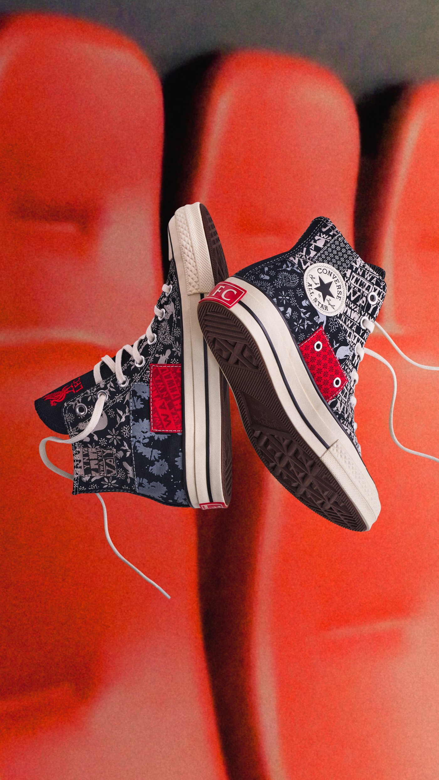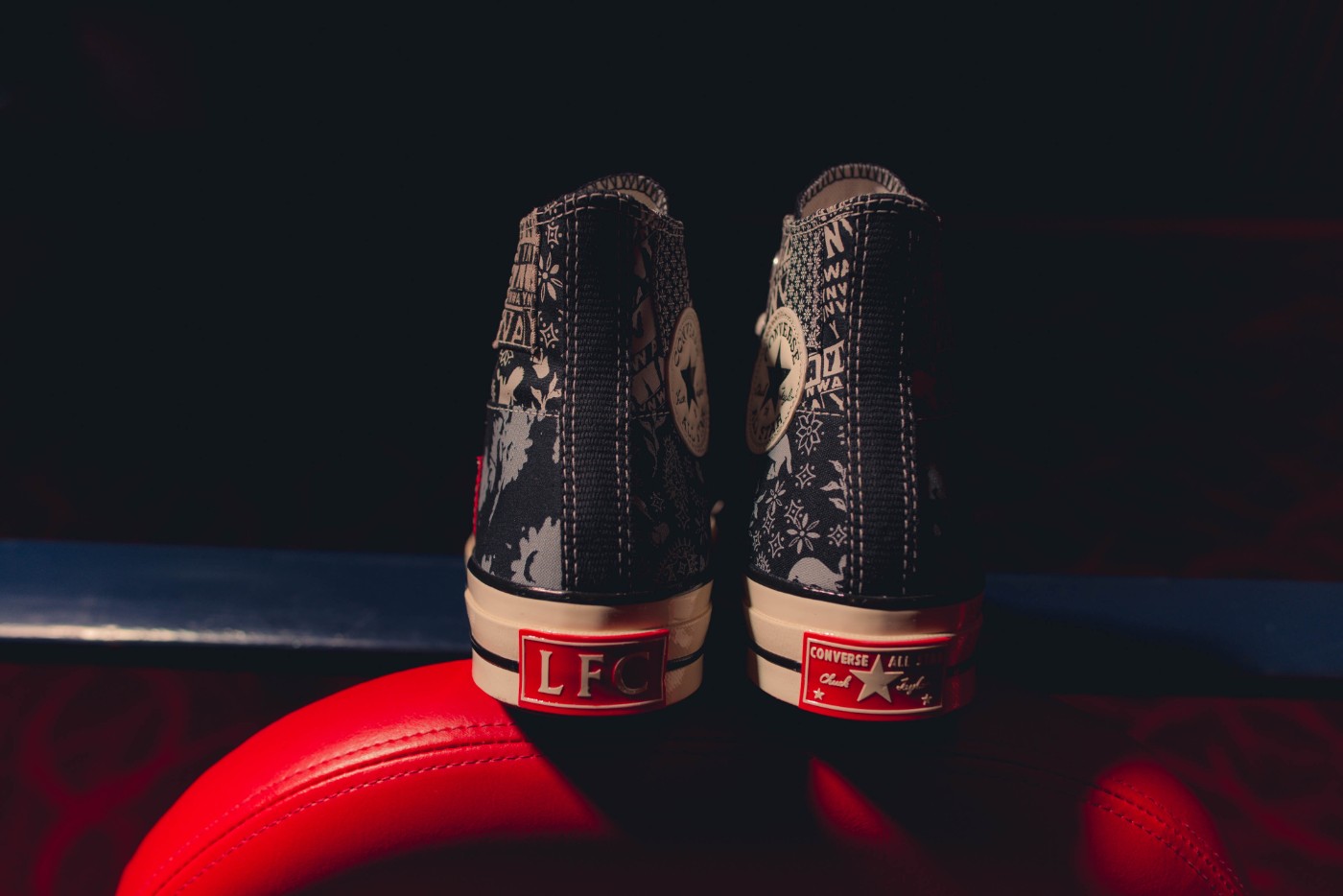 鞋款方面,第一双采用 Converse 经典的 Chuck 70 Hi 为蓝本设计,黑白双色妆点,鞋面印有利物浦标志,十分帅气。