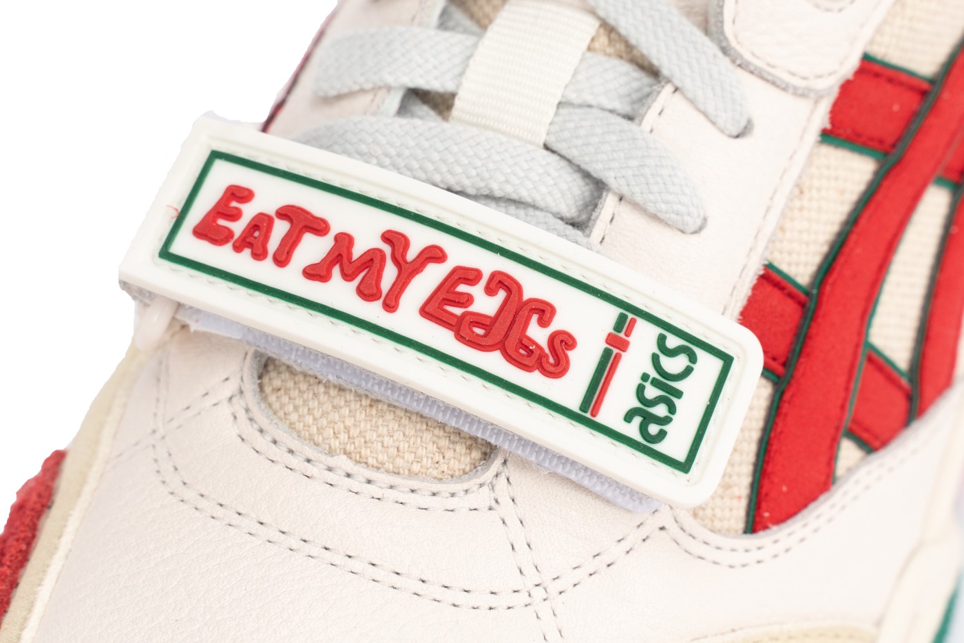 鞋带处的魔术贴印有 “EAT MY EGGS”,彰显联名身份。