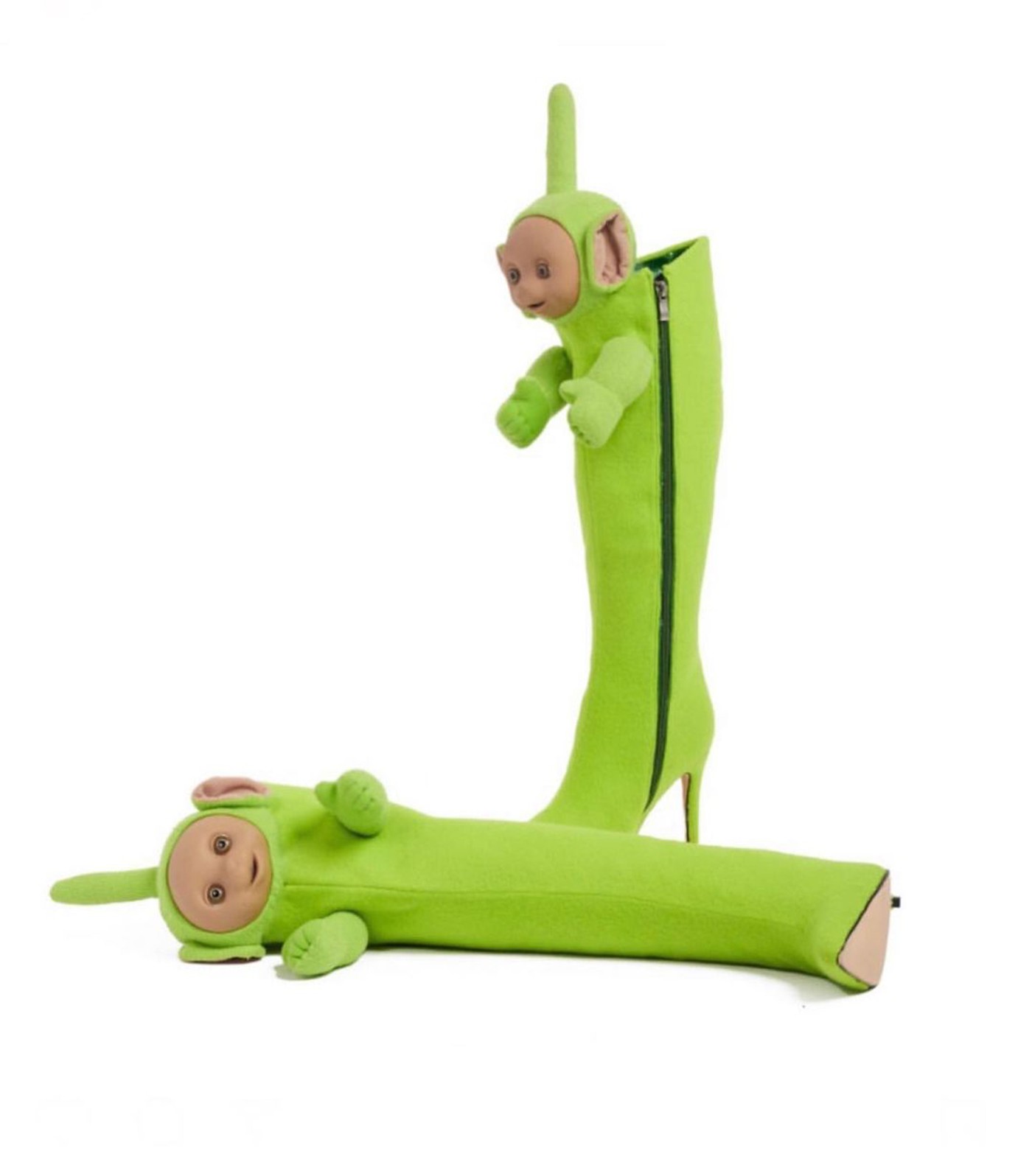 但在众多产品当中,一双天线宝宝造型的鞋款吸引了众多玩家的注意,绿色的迪西(Dipsy)造型,直接变成了一双长筒靴。
