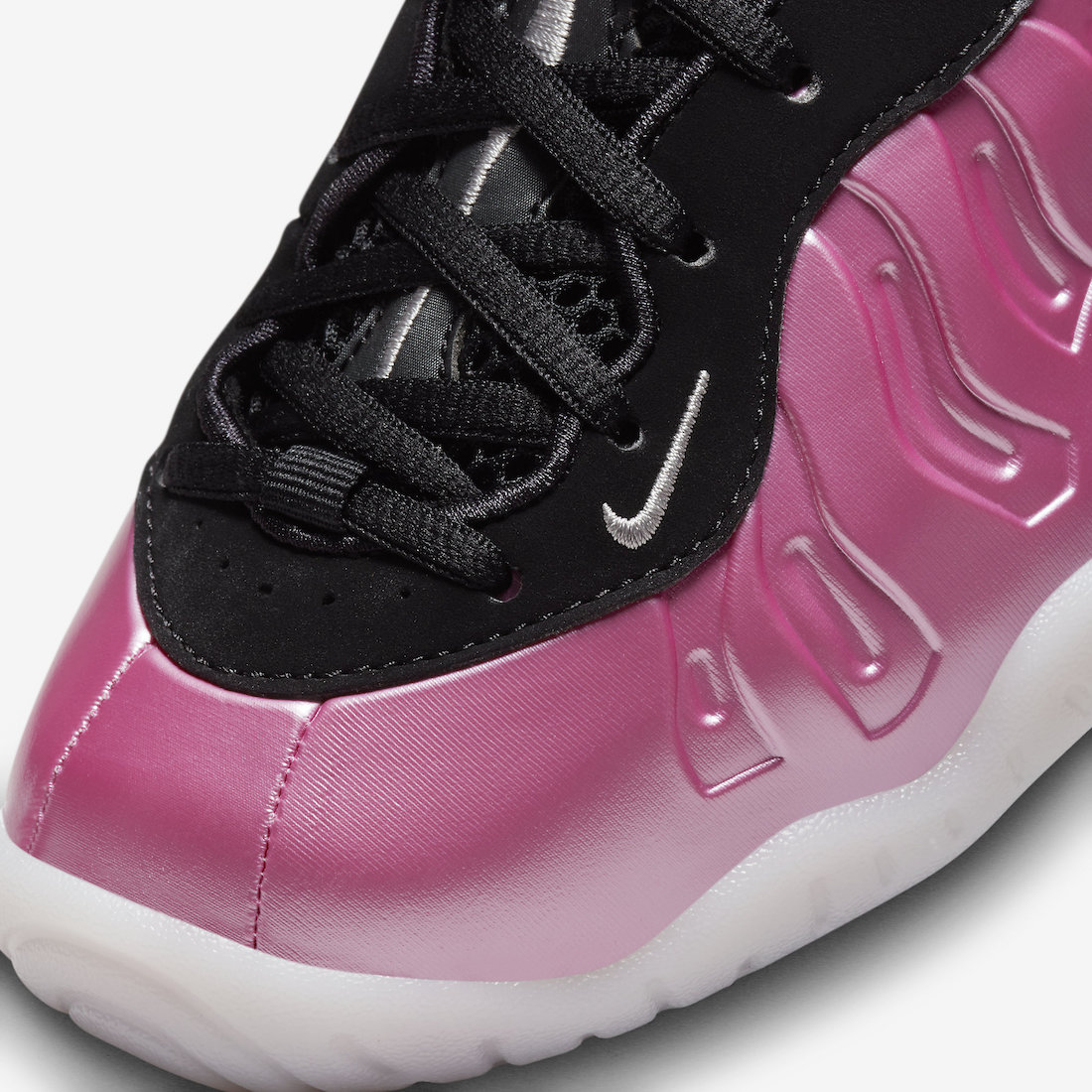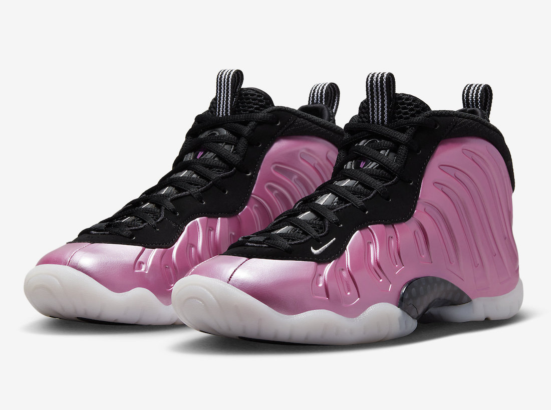 从目前释出的官图来看,鞋身配色完美继承了 Polarized Pink 粉喷的经典色调和光泽质感,但由于是童鞋 Little Posite One 规格,所以鞋面的发泡材质明显不如成人款 Air Foamposite One 饱满,原有碳板也改为玻璃纤维呈现。