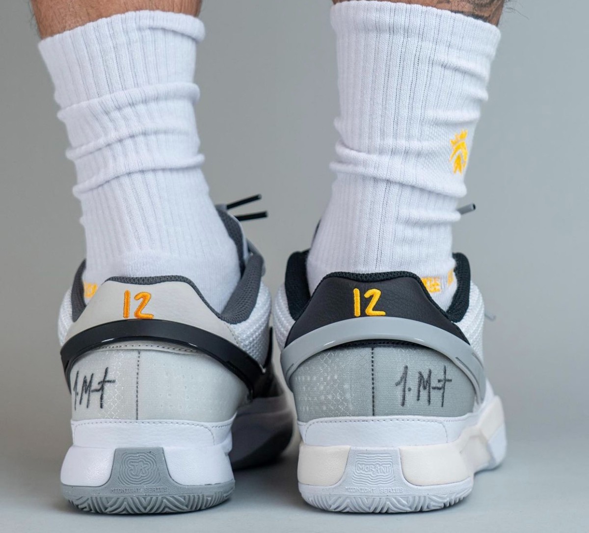 细节方面,除了鞋舌上的个性化 “JA” 字母外,后跟部分还写有他的座右铭 “不逊色于任何人(Beneath No One)”,尽显签名鞋款身份。