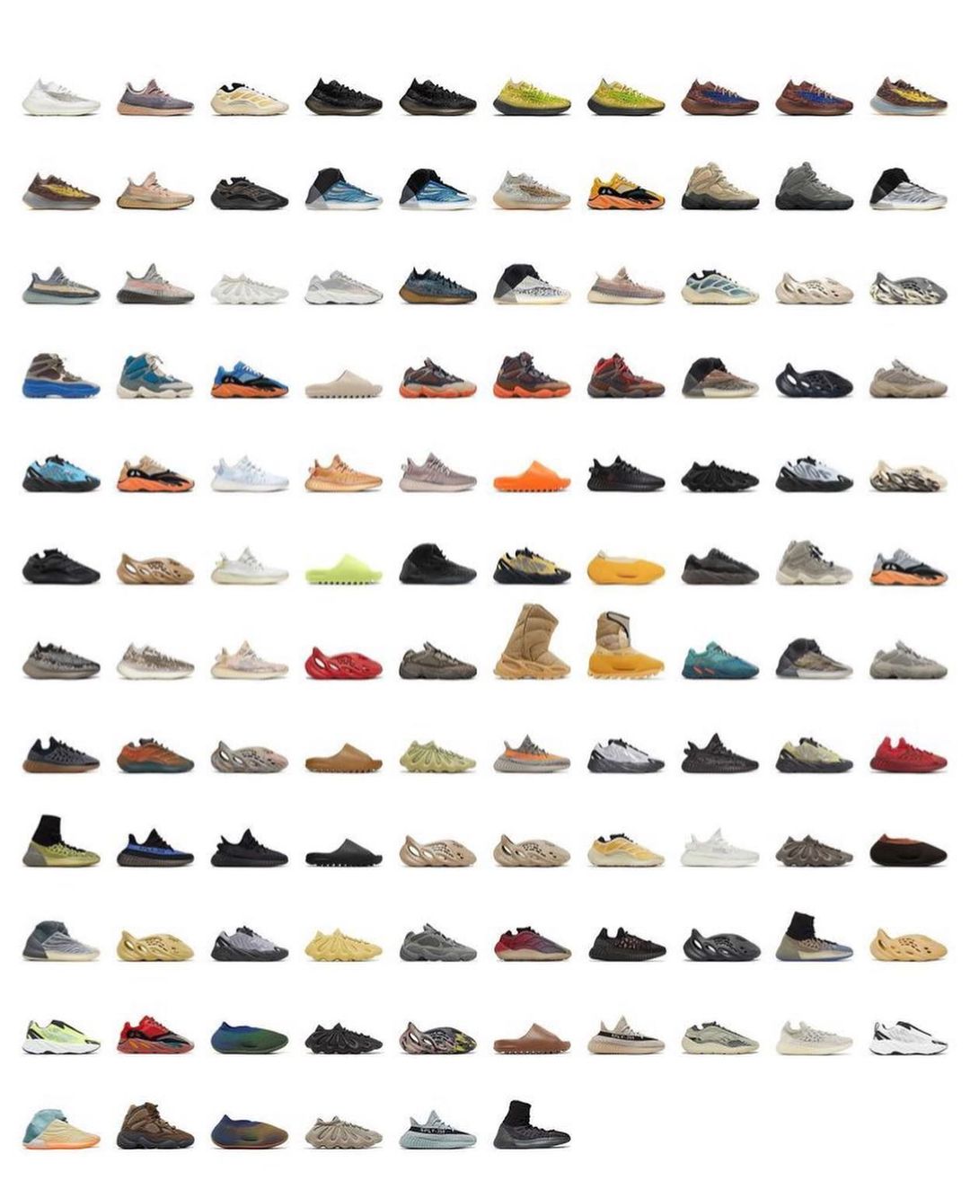近期国外球鞋账号,统计了侃爷任职 adidas 时期所打造的所有 Yeezy 系列鞋款及配色,仅仅鞋型就包含了 20 多个,配色更是达到了恐怖的 200+,可见创造力之强。