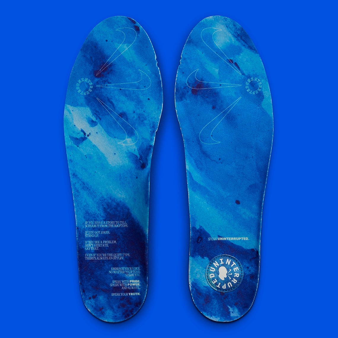 侧身双 Swoosh 由 PVC 材质打造,后跟蓝色纽扣和鞋内侧上还写有 UNINTERRUPTED 字样,彰显鲜明的联名身份。