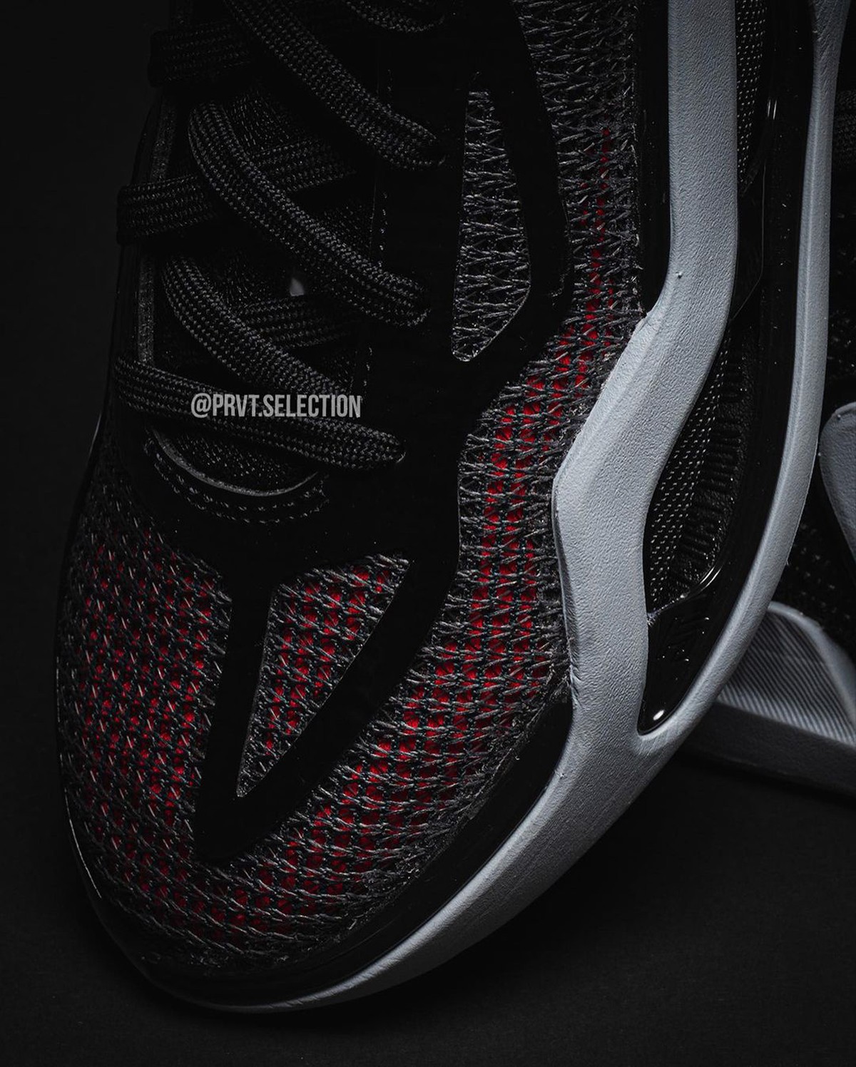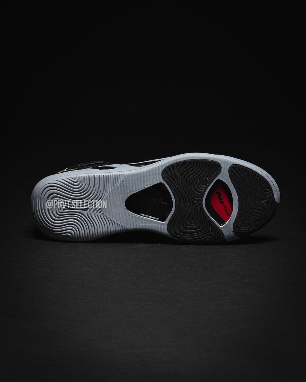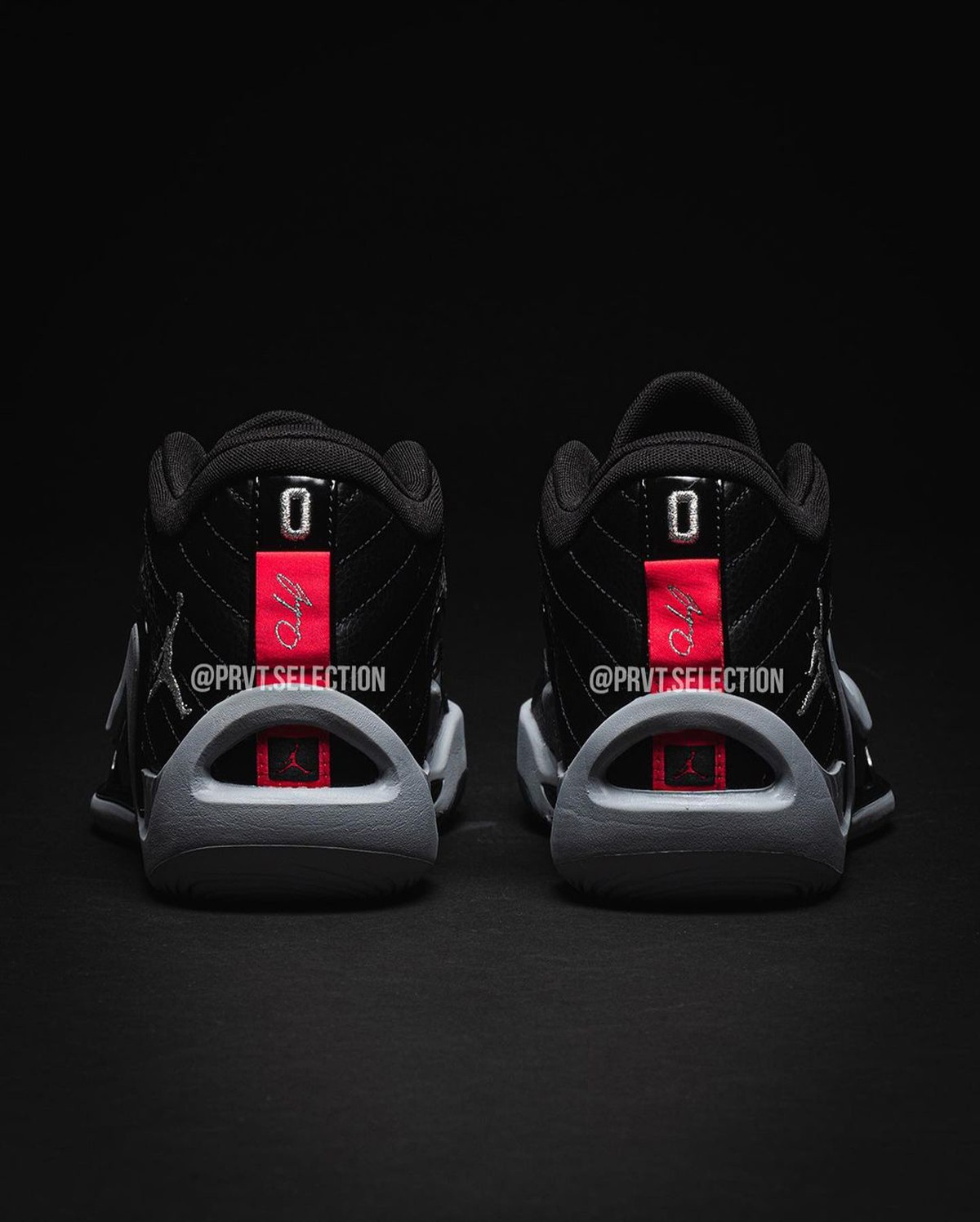 整双鞋以通体黑色打造,红色与灰色的细节点缀,加上后跟的荔枝纹皮革,为鞋款增添了几分亮眼细节。
