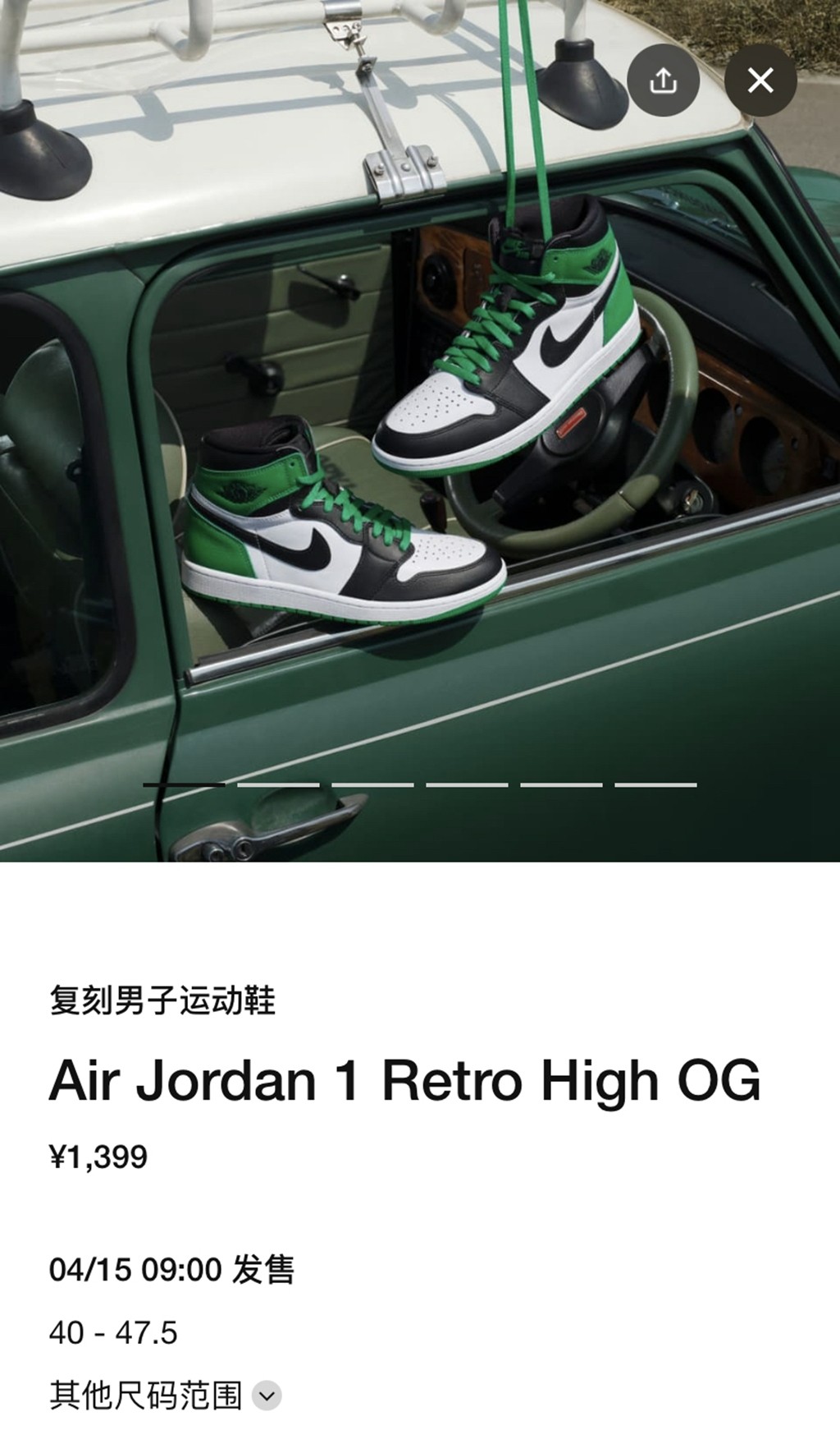 据悉,全新 Air Jordan 1 High OG “Lucky Green” 将于 4 月 15 日上午 9:00 发售,定价 ¥1399 元。
