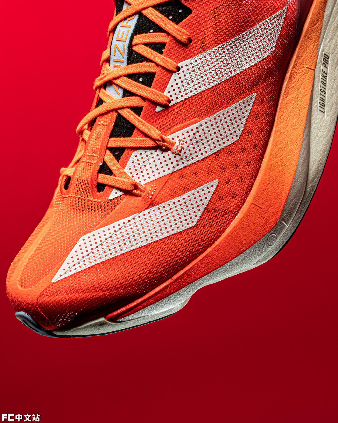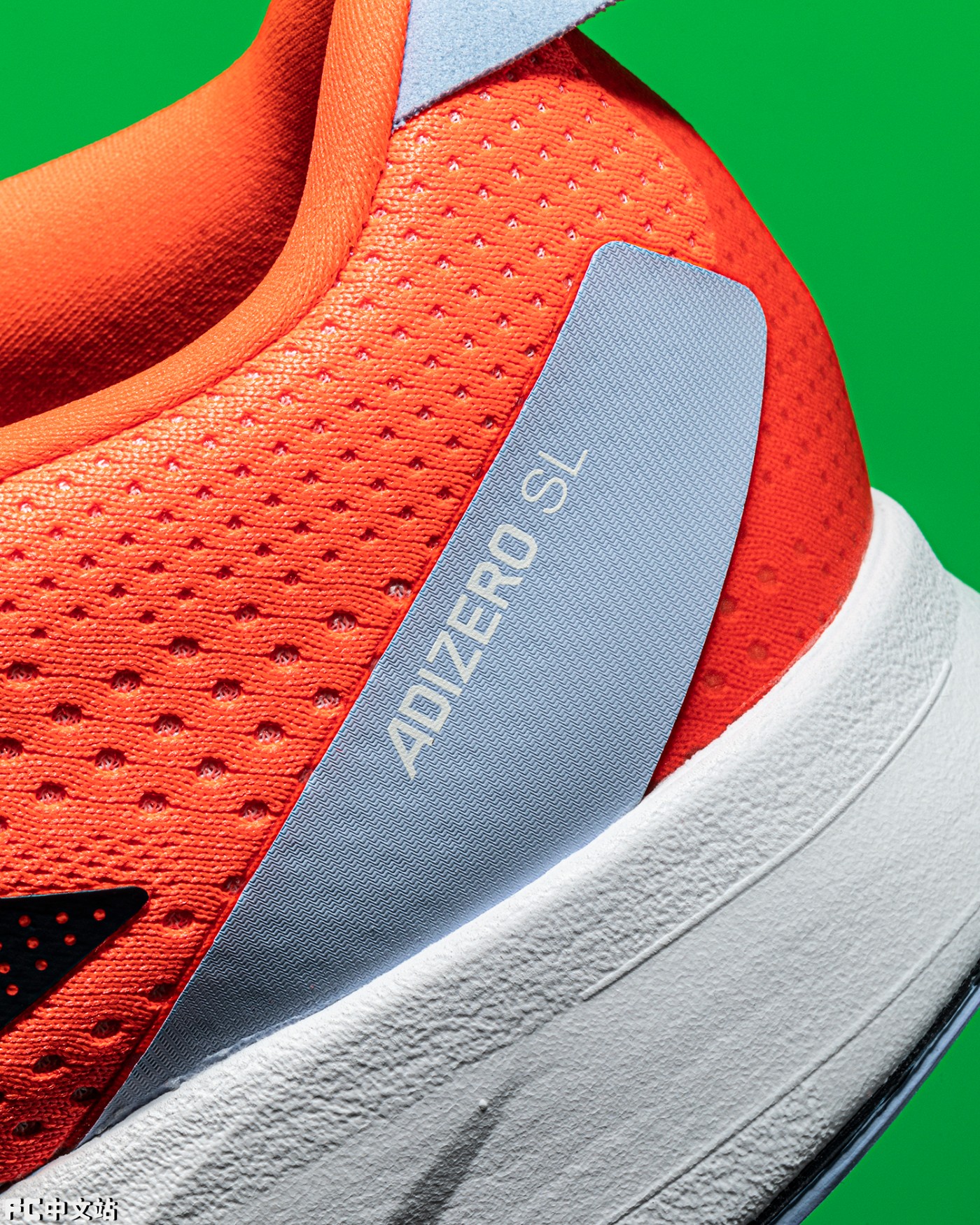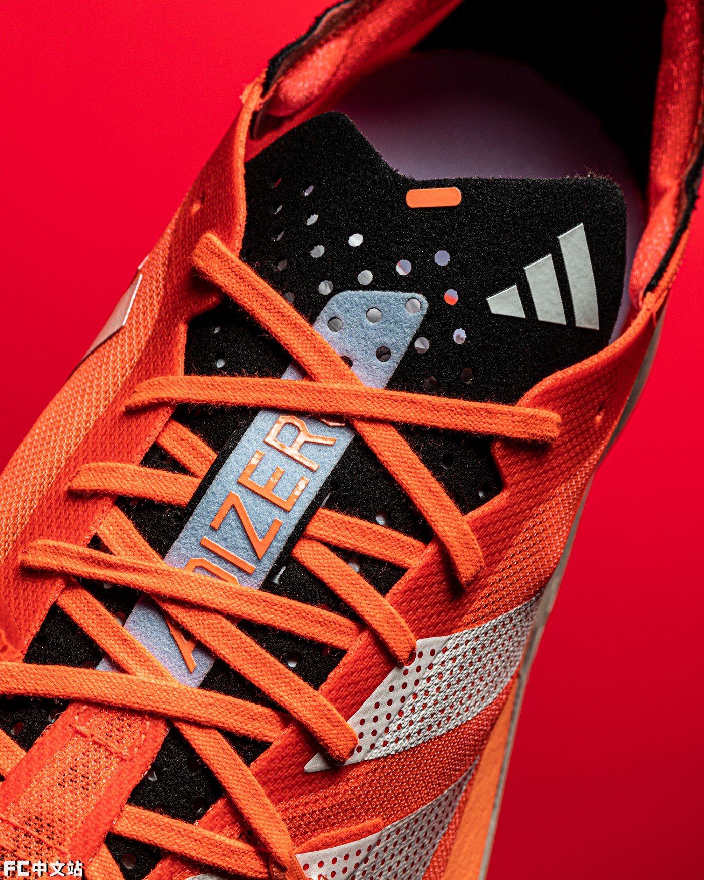 超轻质的鞋舌采用类似植绒的材质打造,点缀 ADIZERO 字样以及 adidas 标志性三线 LOGO。