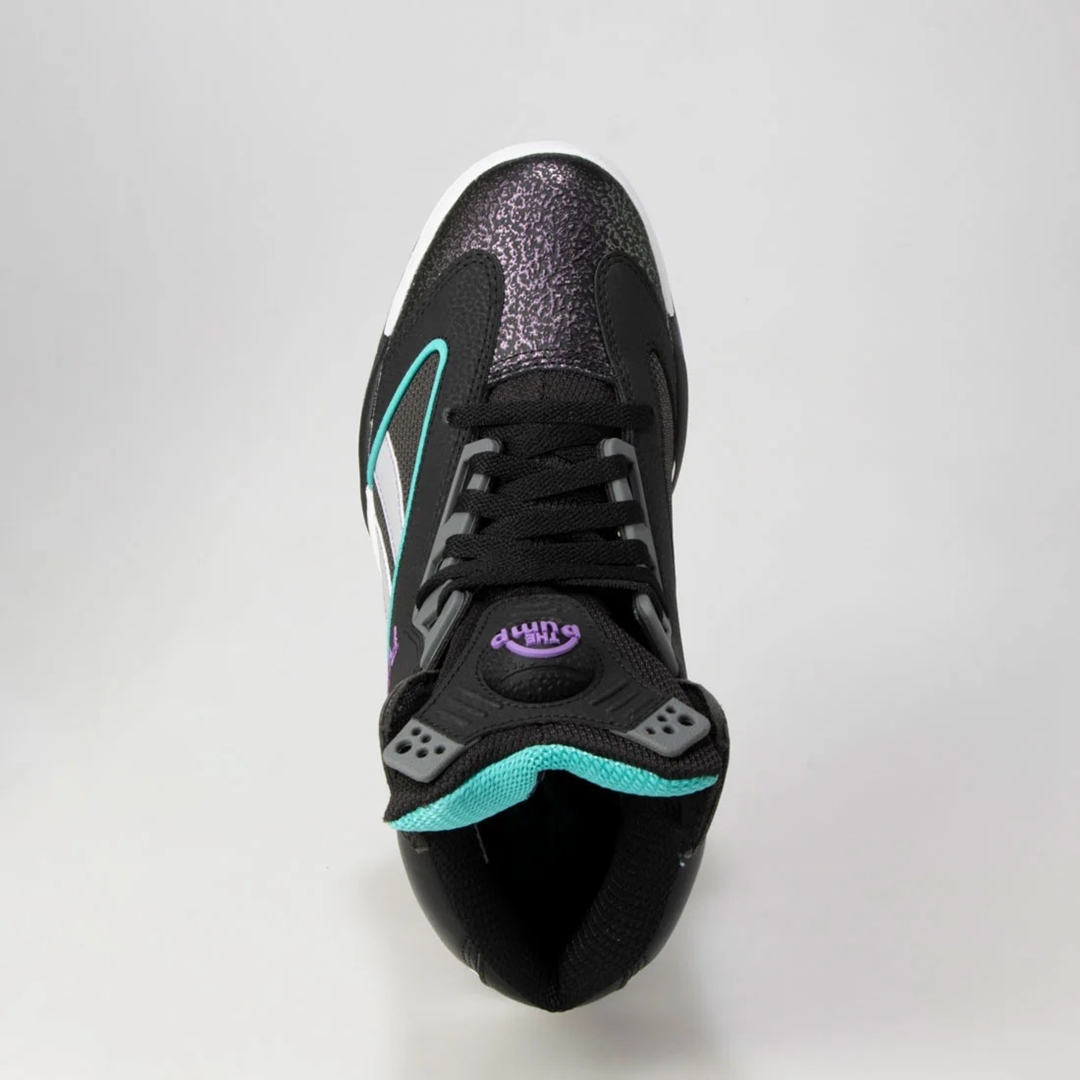 鞋身以黑色为底,细节部分采用紫、祖母绿双色呈现,造型活力十足。