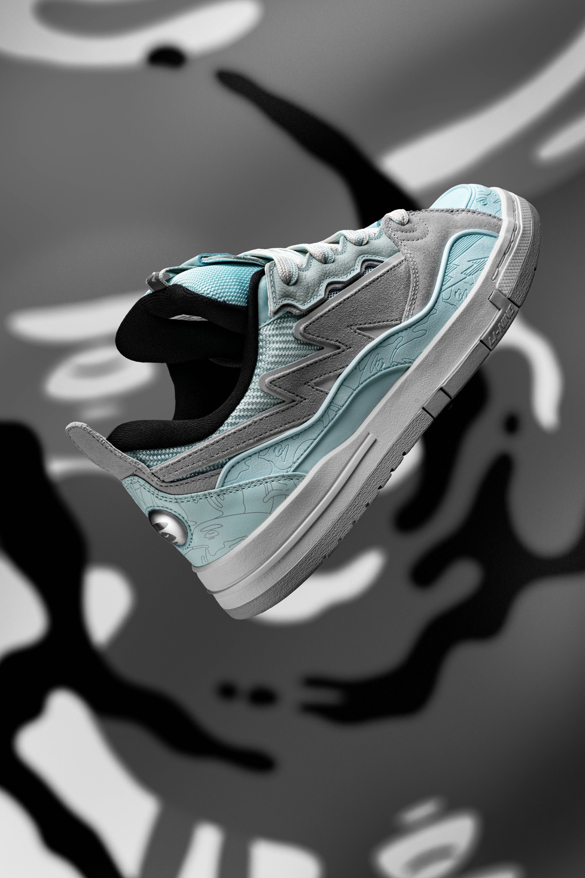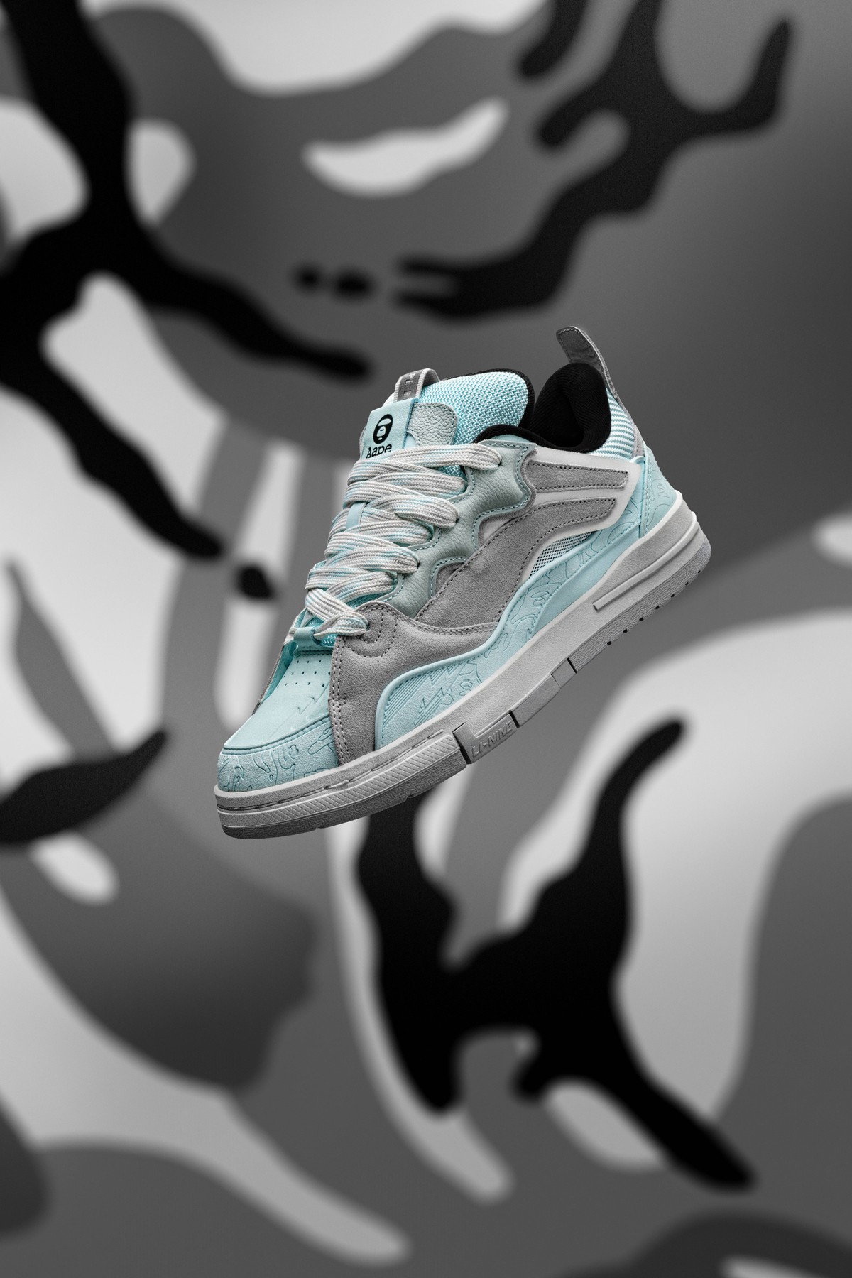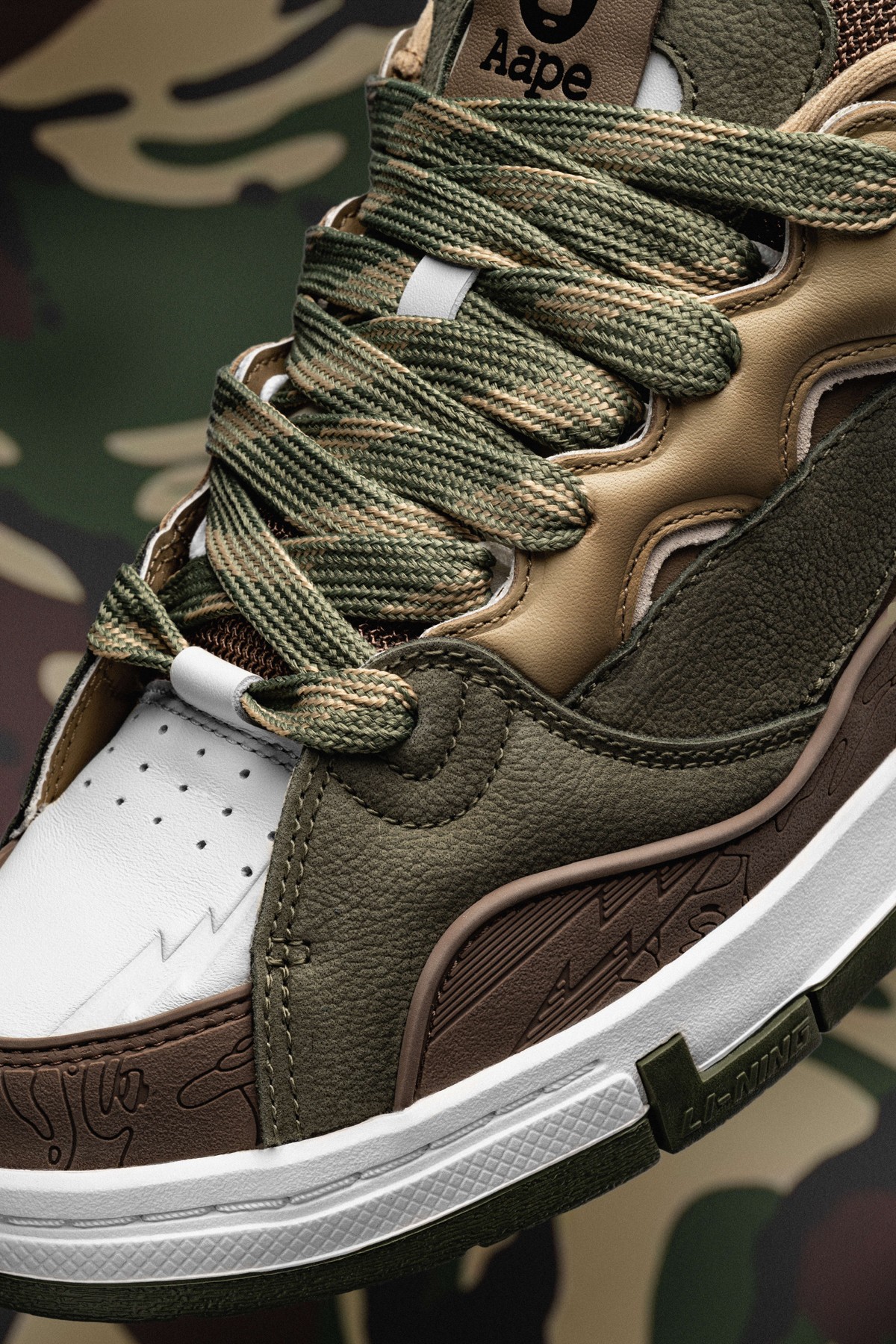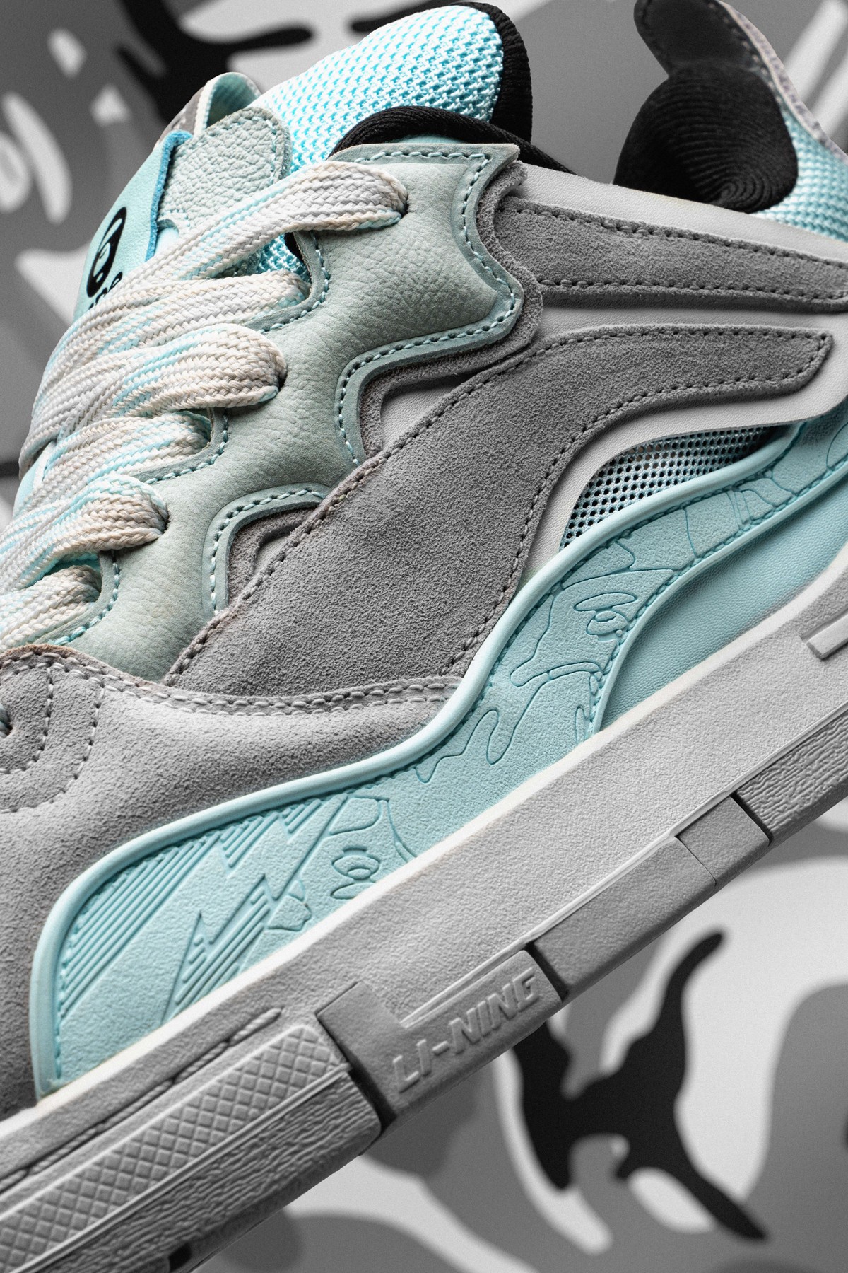 鞋身内外两侧以鸳鸯设计打造,左侧为李宁反向 Logo,右侧为 AAPE 闪电 Logo,彰显联名特殊身份。