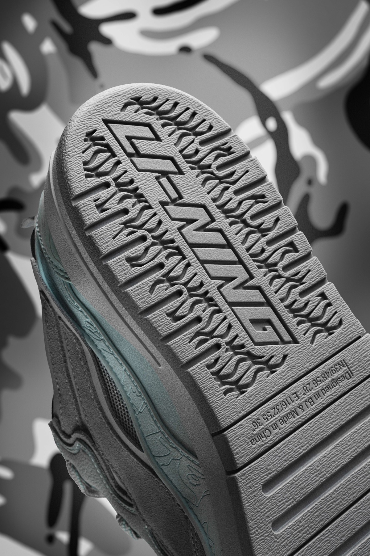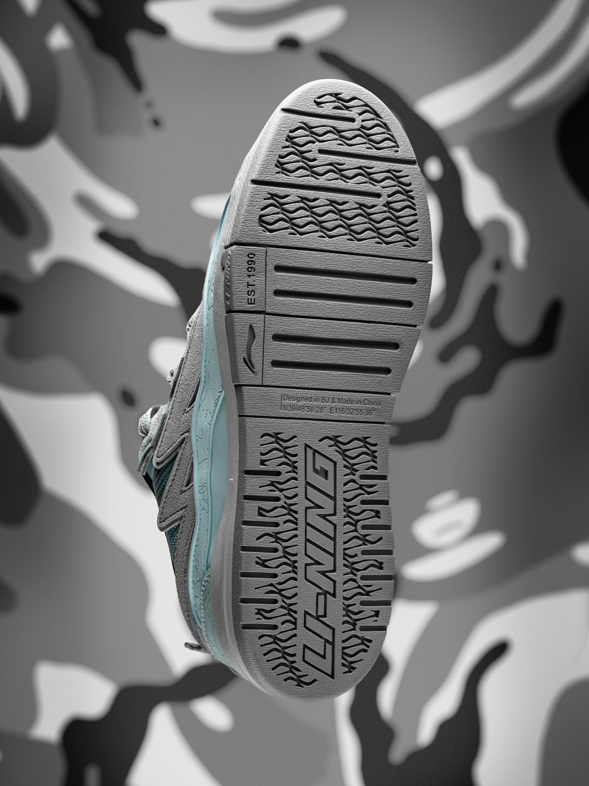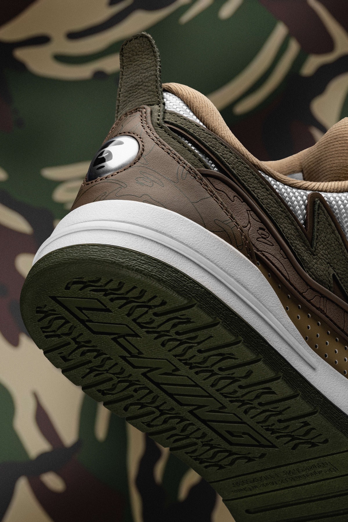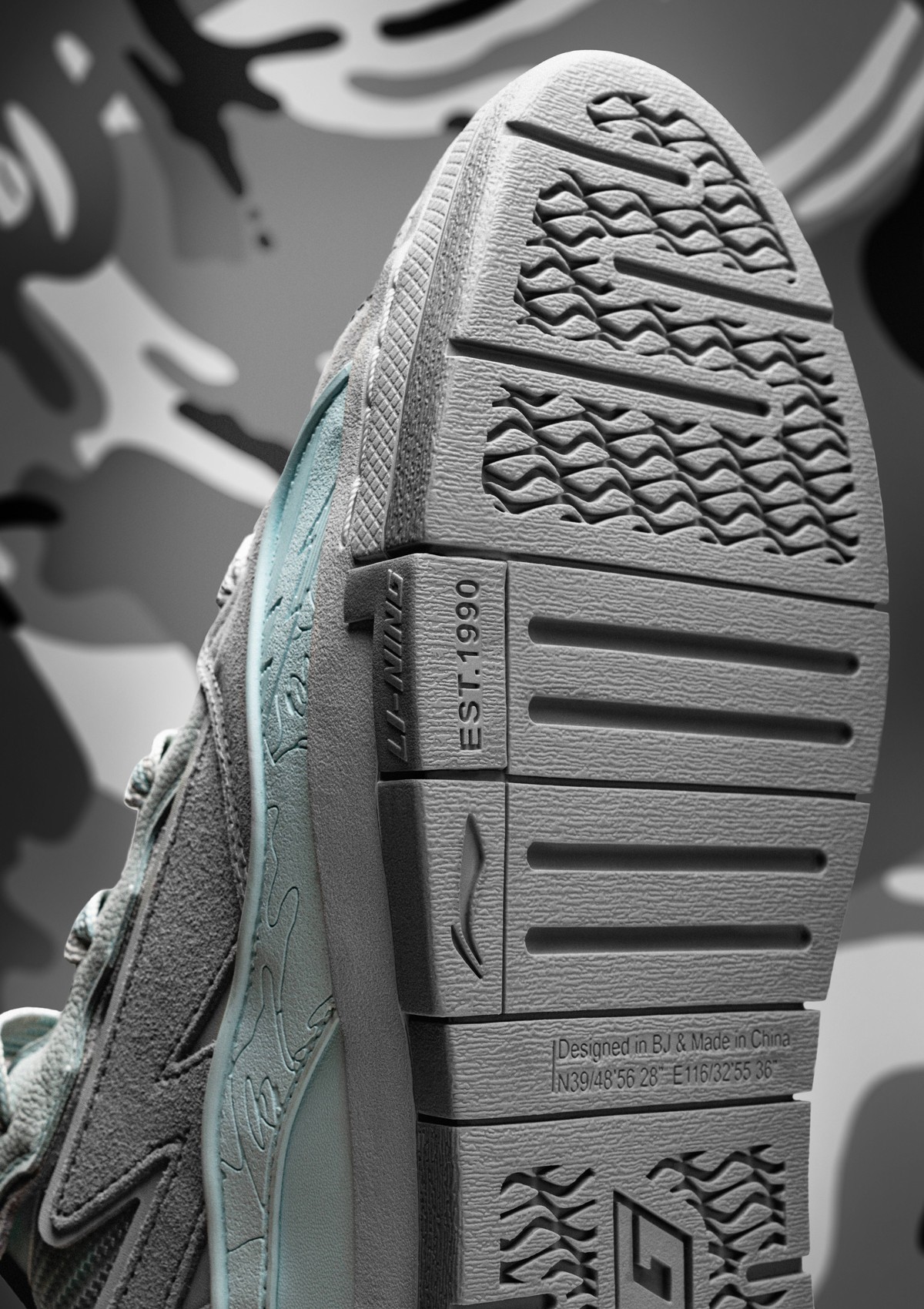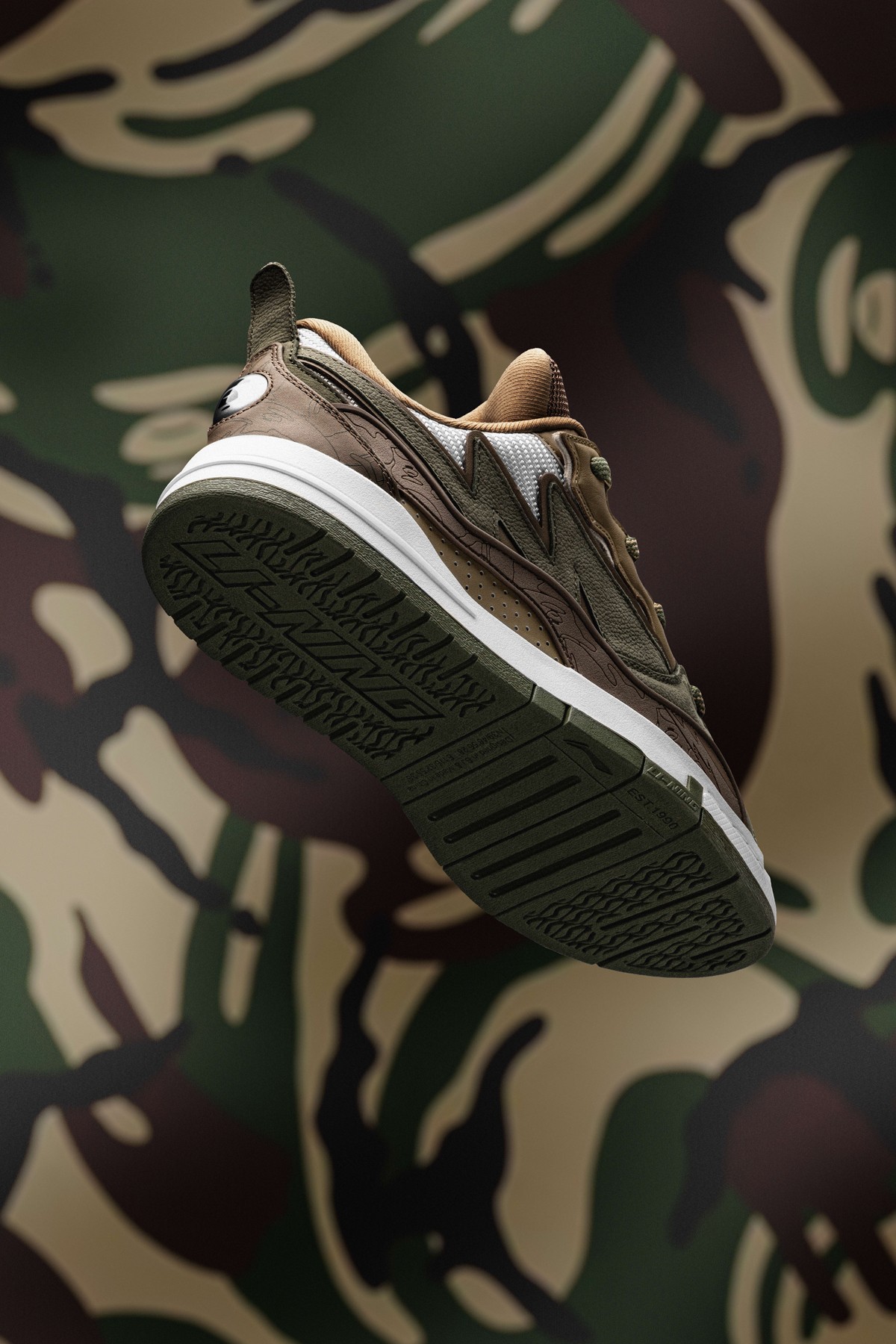 鞋身内外两侧以鸳鸯设计打造,左侧为李宁反向 Logo,右侧为 AAPE 闪电 Logo,彰显联名特殊身份。