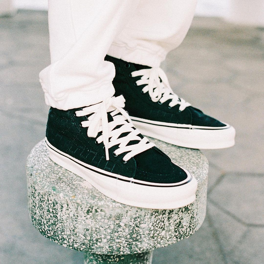 第二双 OG Sk8-Hi LX 使用网格状的黑色帆布鞋面搭配白色大底,致敬卡西米尔·赛文洛维奇·马列维奇的代表作《白底上的黑色方块》,展现出独特的时尚感。