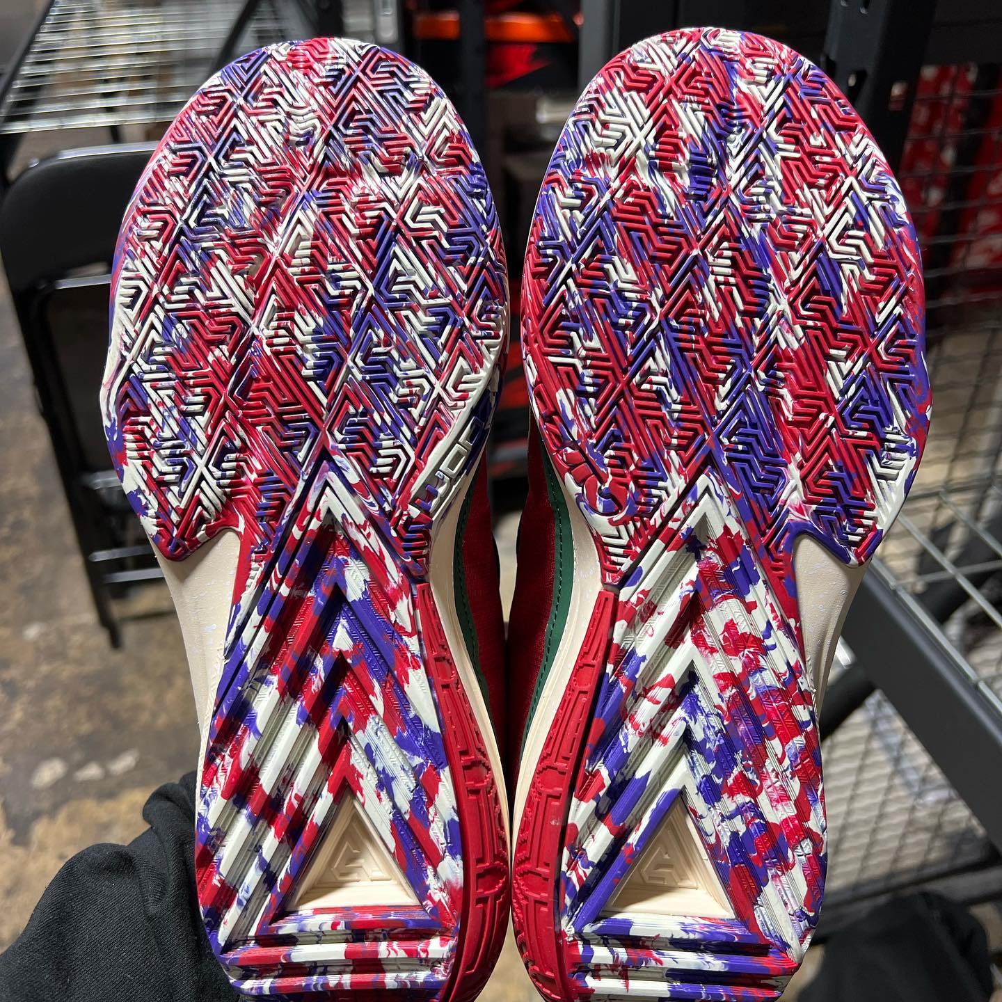 整双鞋采用深绿色搭配红色打造、金色点缀鞋身细节,将雄鹿主场配色的基因展露无遗。