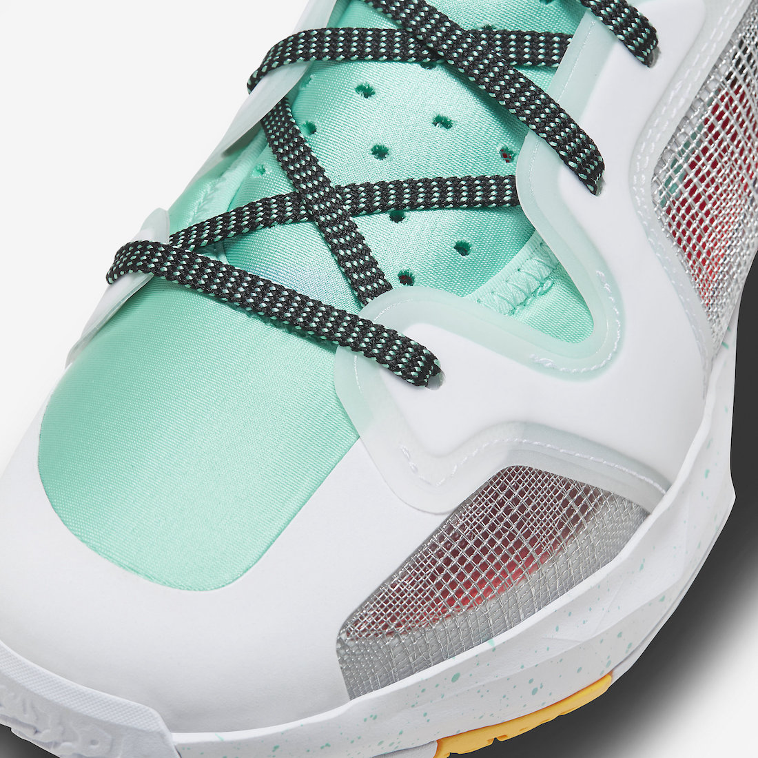 整双鞋依旧采用白色为主调,辅以薄荷绿色妆点,呈现出小清新造型的同时,也彰显出了郭艾伦 PE 配色一直以来的血统。