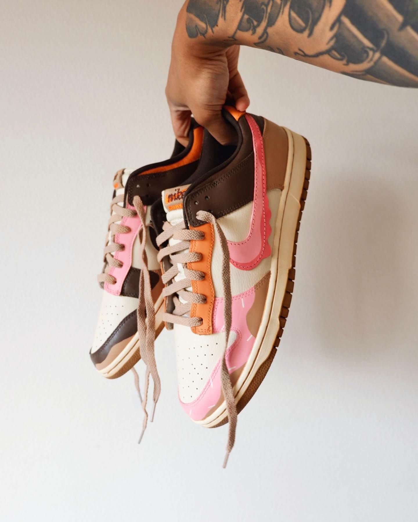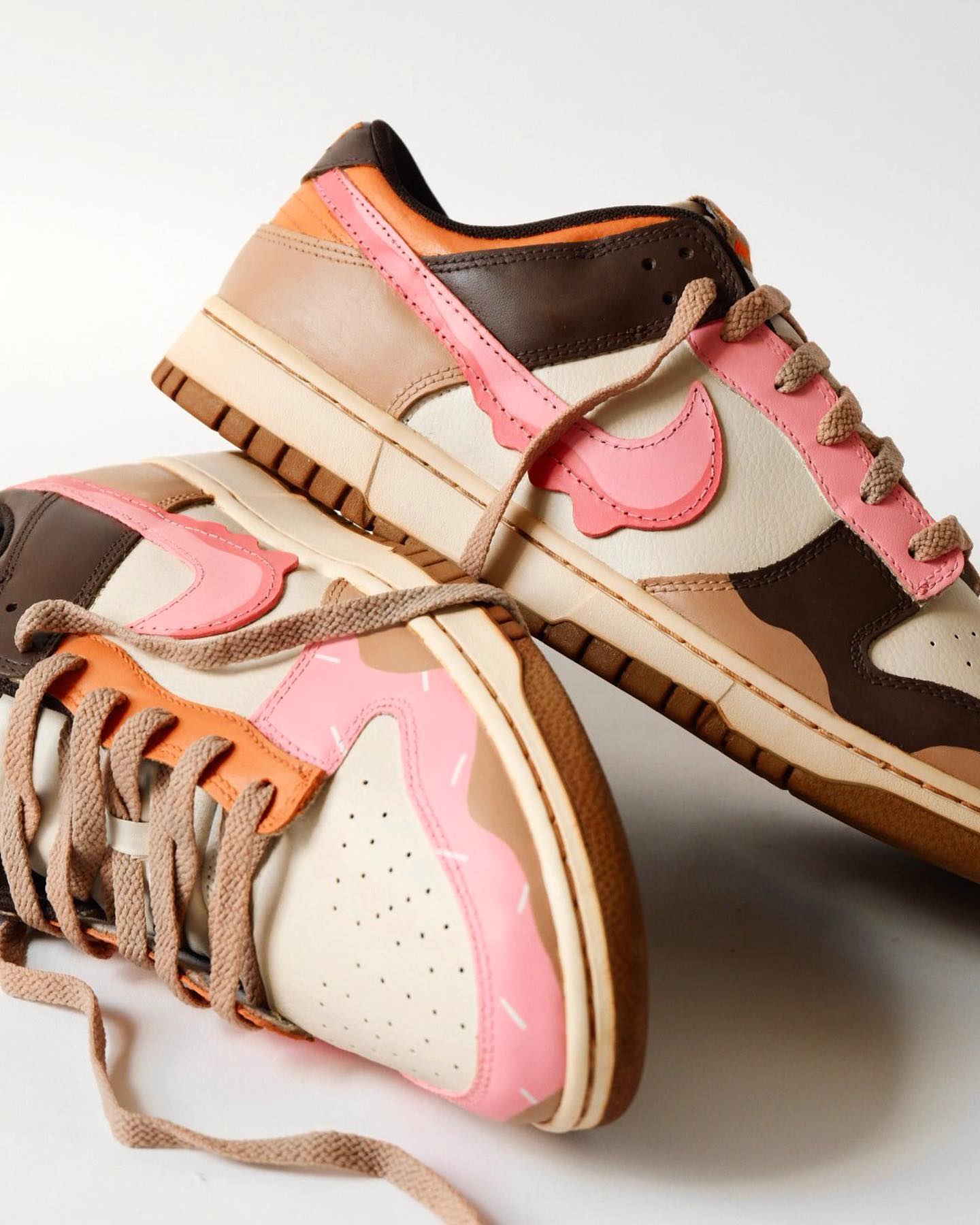 整双鞋采用棕色和粉色搭配,呈现出甜甜圈和咖啡的视觉效果。
