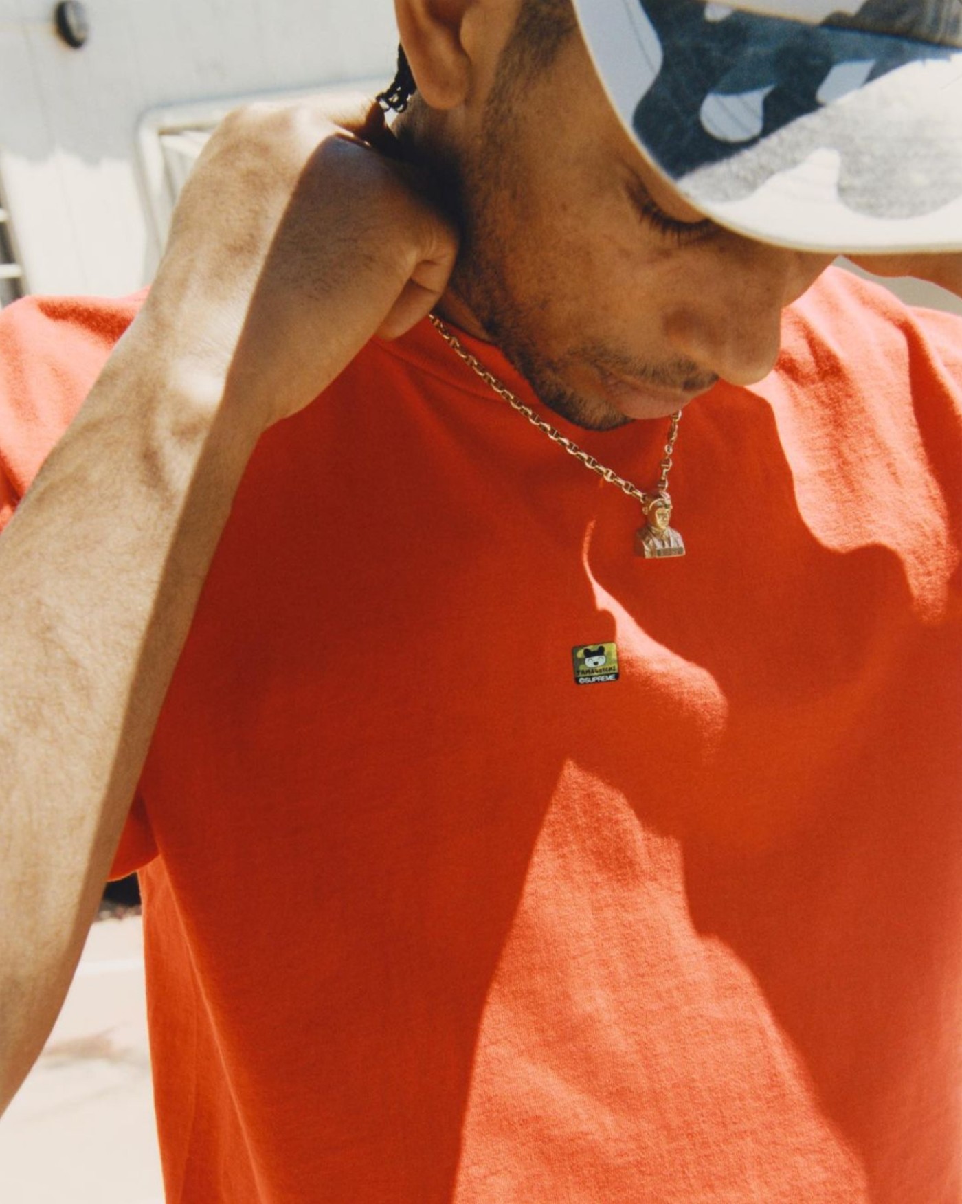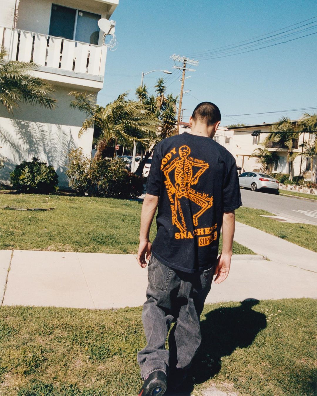 其次是印有 Mini Suprme Logo 骷髅短袖,虽然正面看上去有些平平,但背面却印有一个硕大的骷髅 Logo。