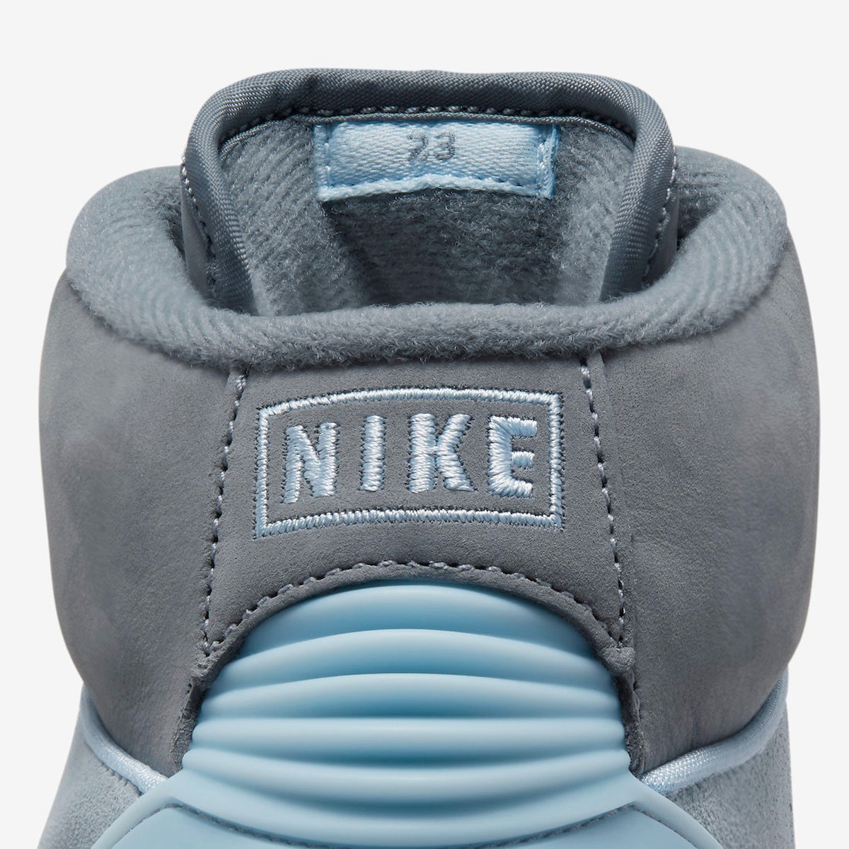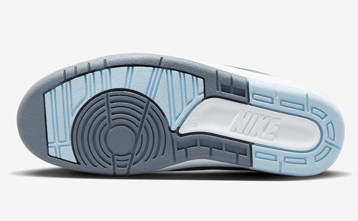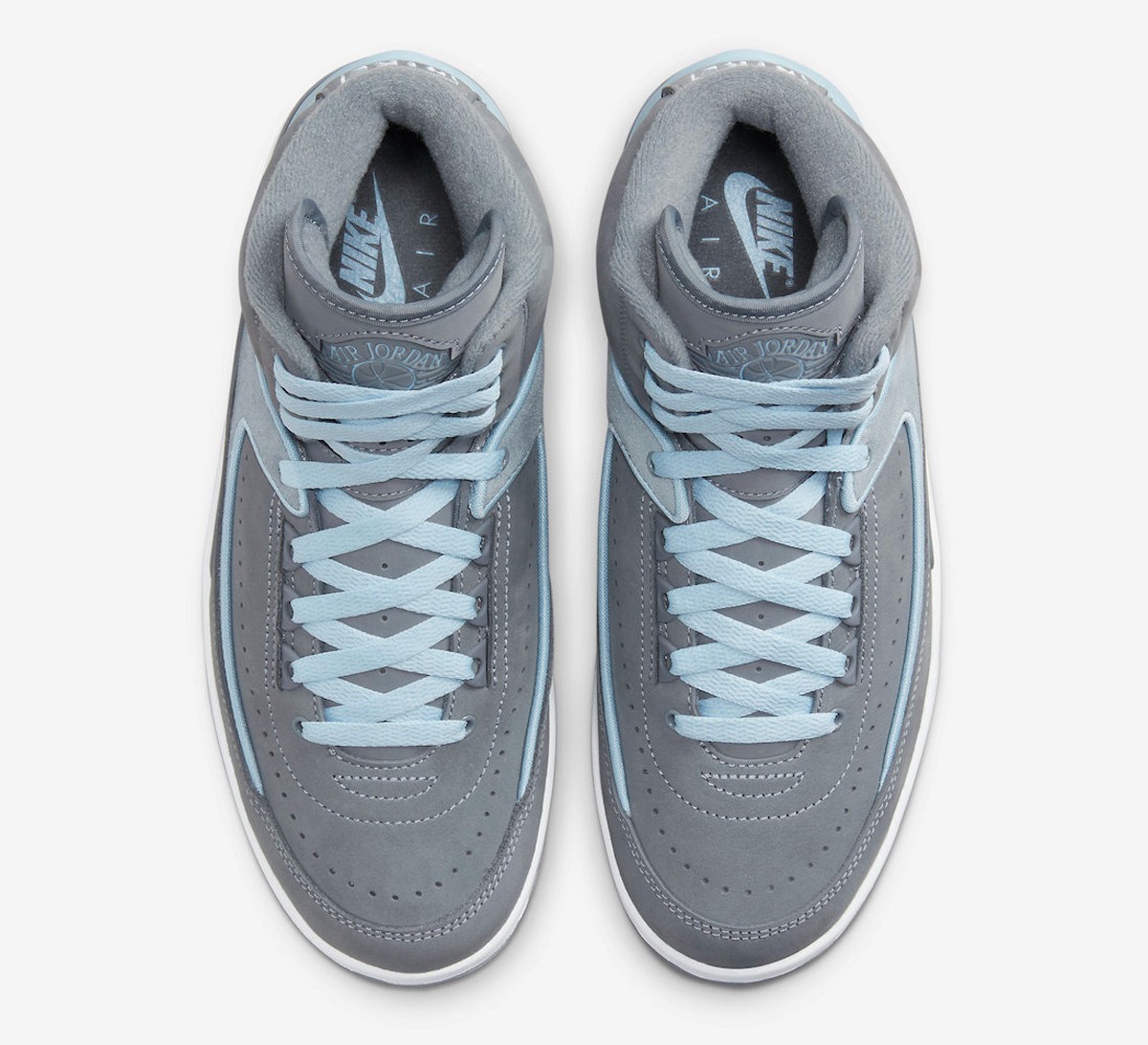 整双鞋以 Air Jordan 2 经典的高帮造型设计,通体灰色的鞋身辅以北卡蓝色点缀,视觉效果相当高级。