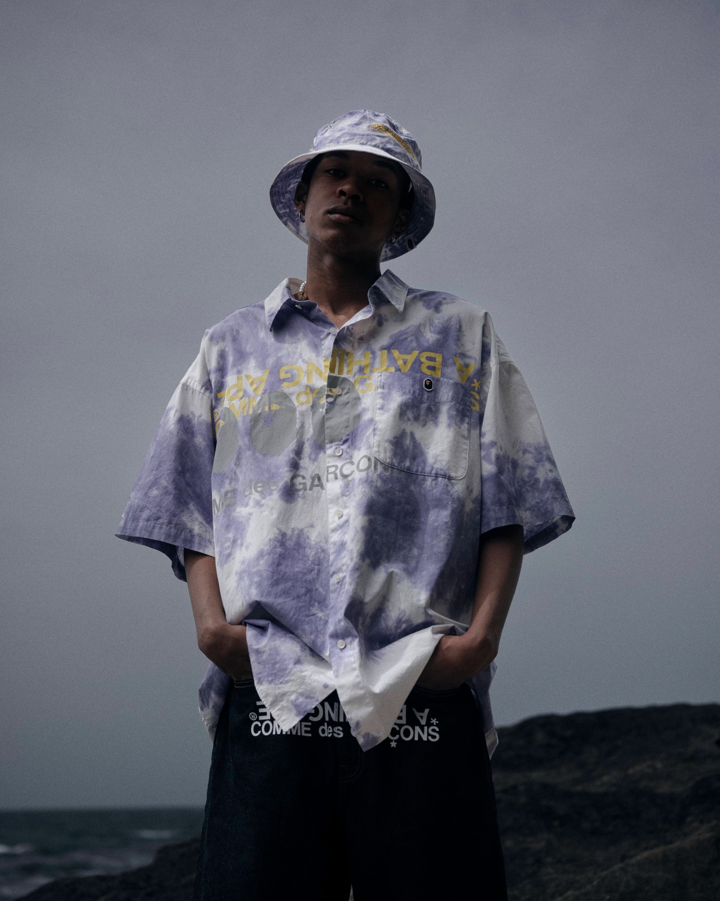 而衬衫和渔夫帽也采用了扎染工艺,将三个猿人 Logo 并排展现,下方还印有 COMME des GARÇONS 字样,彰显联名身份。