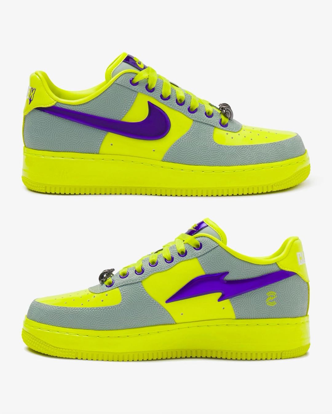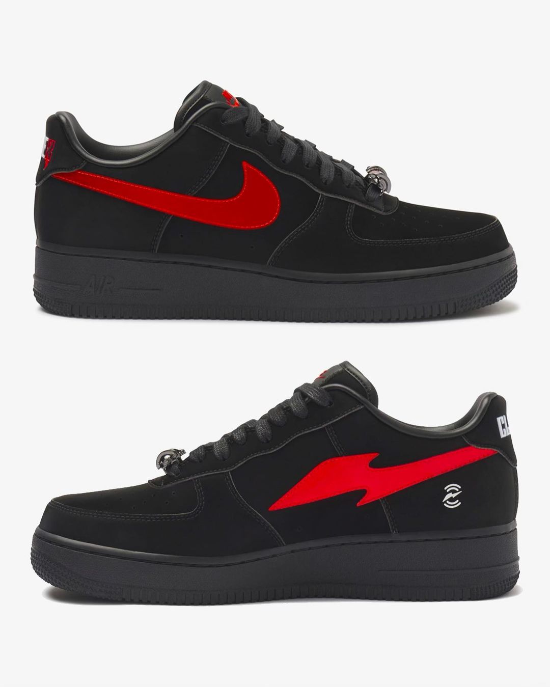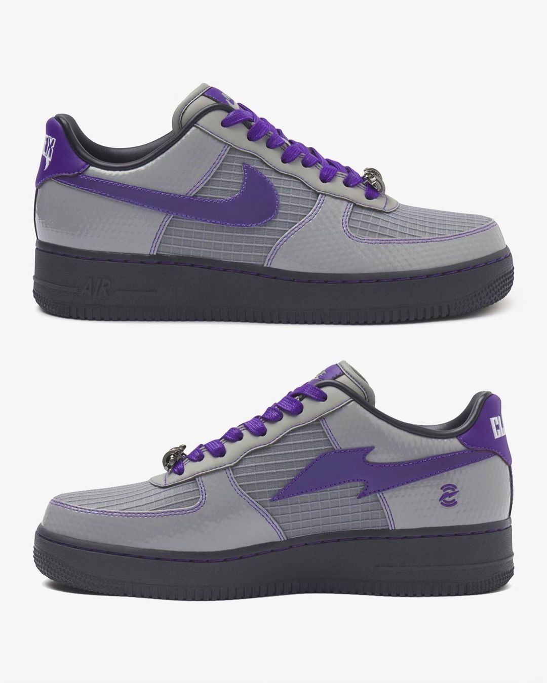 金属质感 Swoosh 随光线变化释放出炫酷氛围,外侧为 Nike Logo,内侧则采用 RTFKT 的闪电图案。