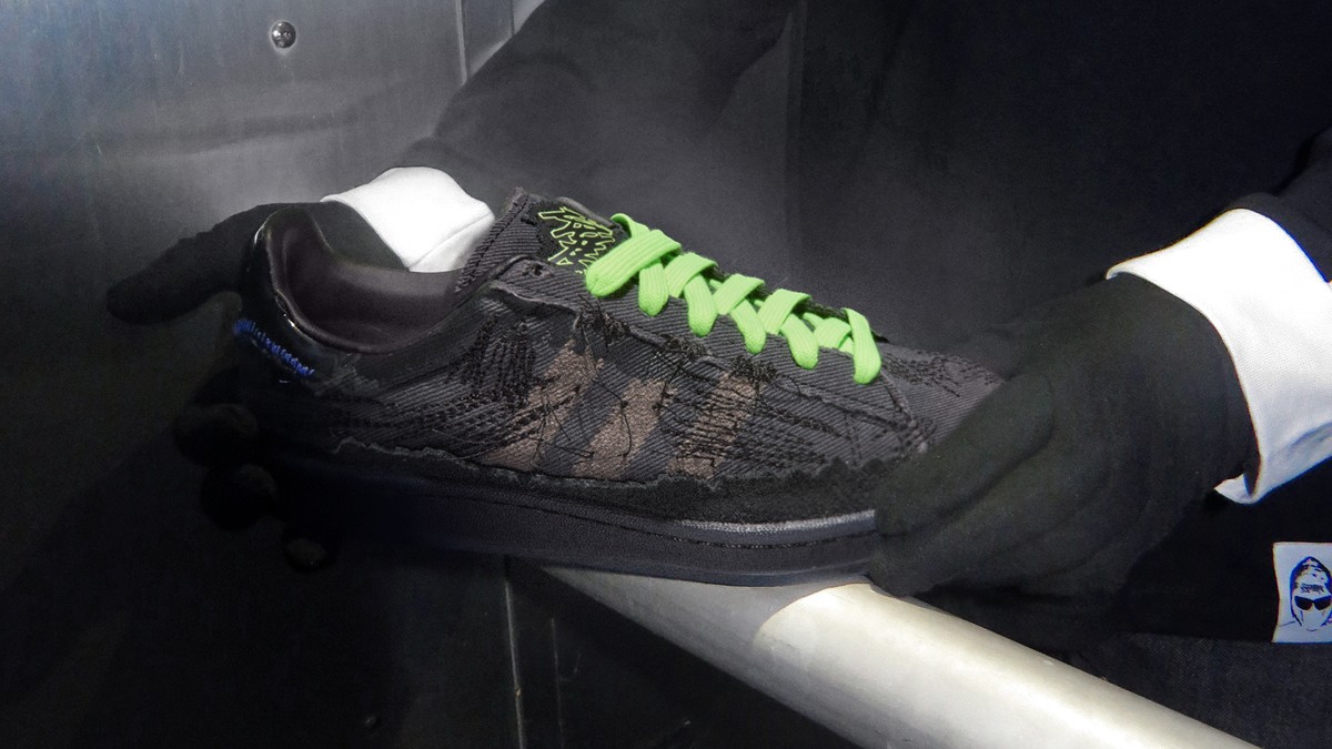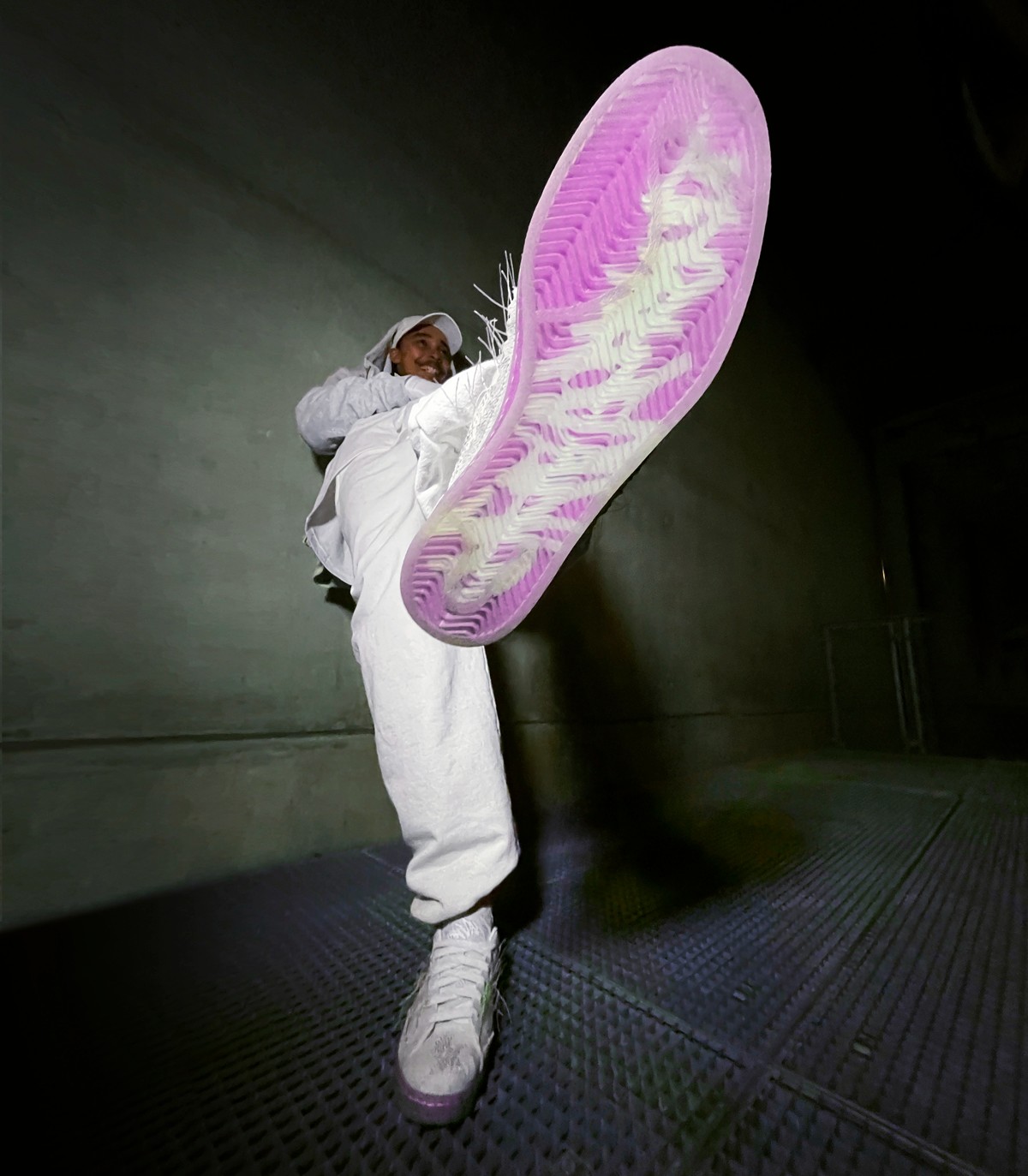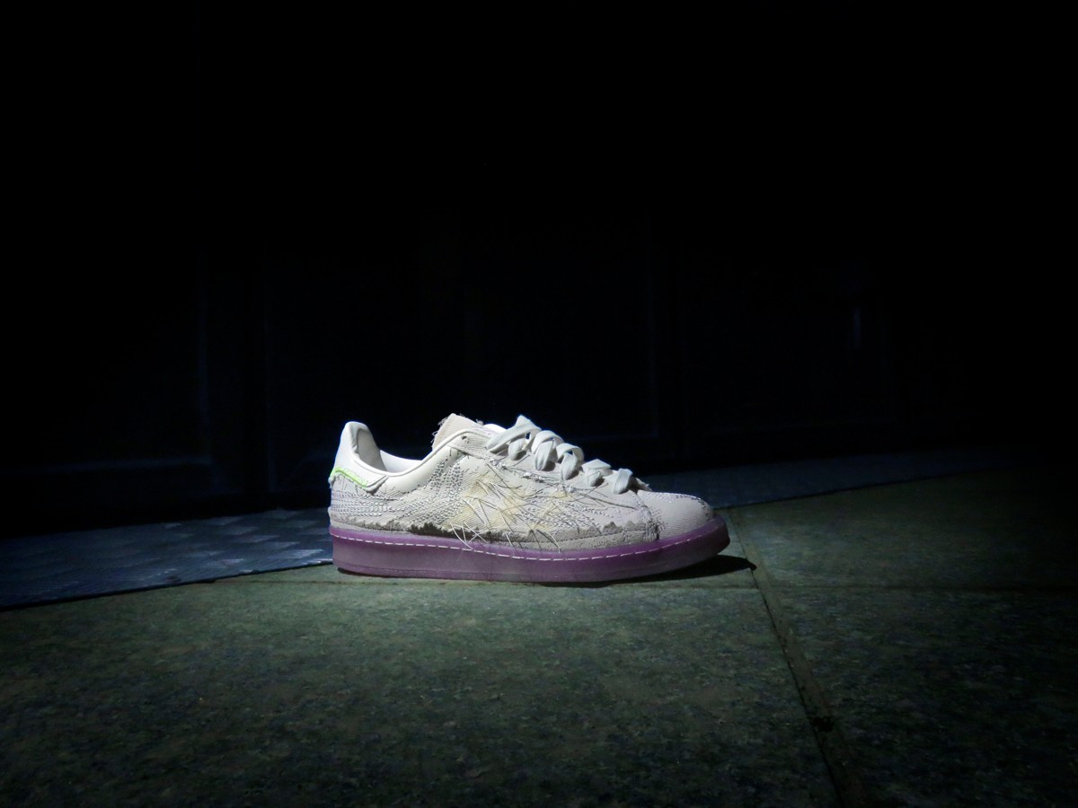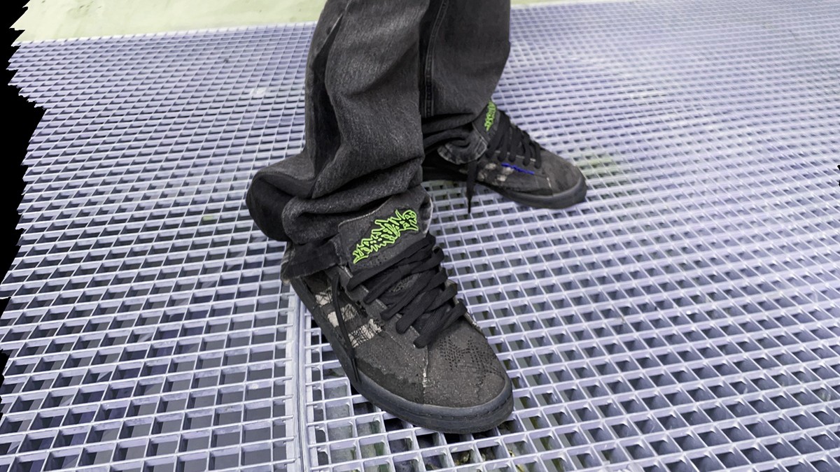 第一双以黑色为主调,并在鞋头、侧身、鞋舌等部分加入多除破坏设计,使整双鞋非常符合亚文化审美。