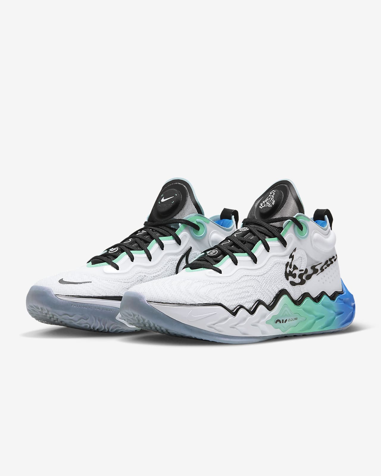 首先来看这双 Nike Air Zoom G.T Cut 2.0,整双鞋采用白色搭配蓝、绿色呈现,Swoosh 采用黑色妆点,配合刀片式纹理鞋面带来十足运动感。