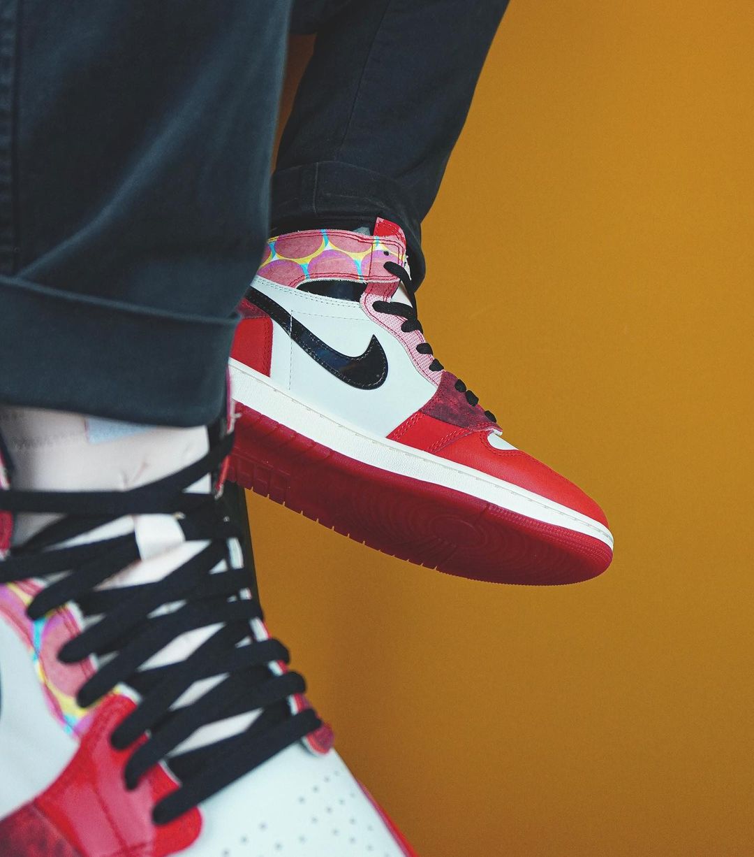鞋面采用皮革、麂皮、漆皮等多种面料拼接打造,鞋身框架还有波点元素呈现,体现平行世界的概念,也契合蜘蛛侠的宇宙设定。