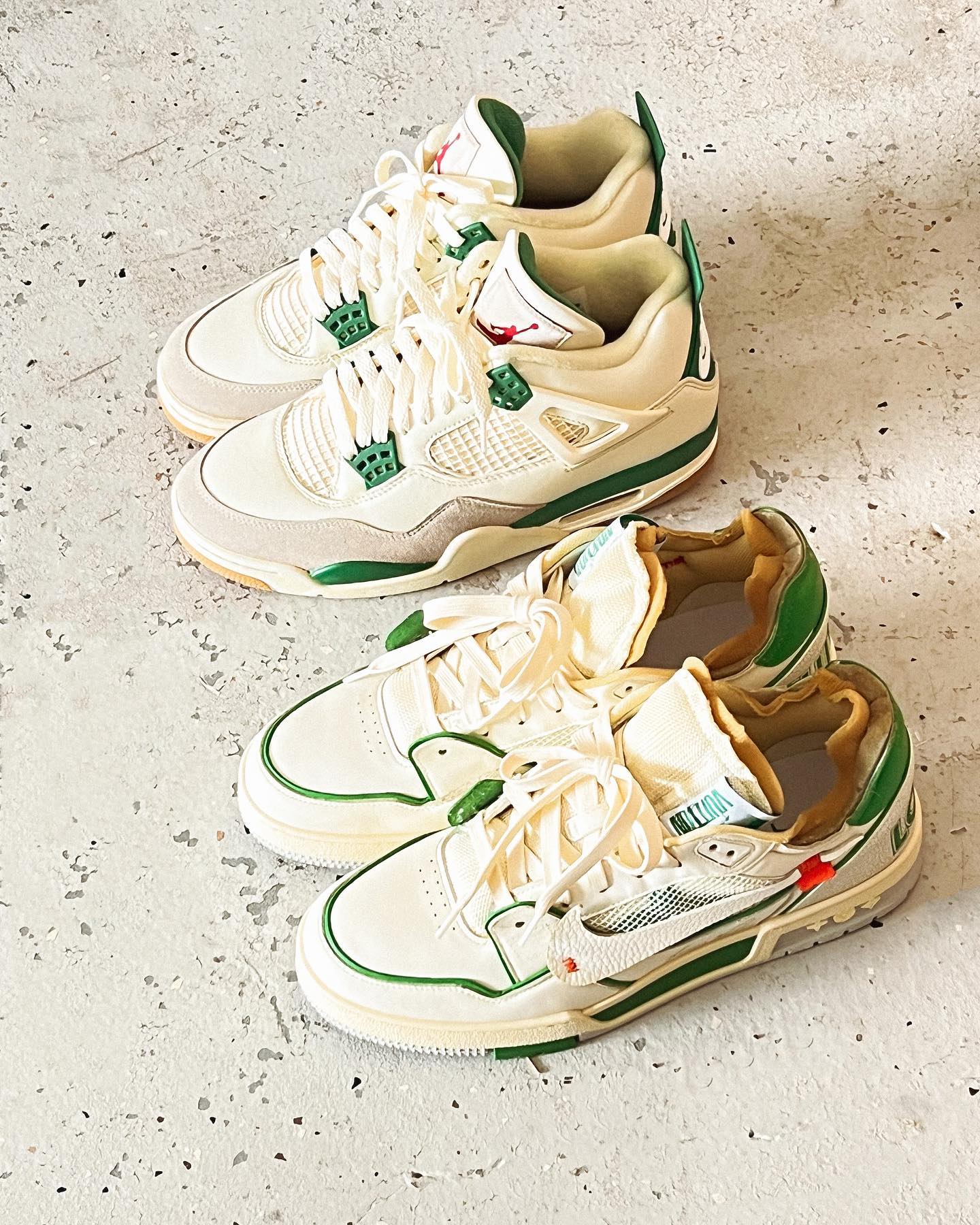 根据他本人的晒图得知,此次白绿色设计是以 Nike SB x Air Jordan 4 和特摄剧《五星战队大连者》为灵感来源,好家伙,BUFF 叠满了!