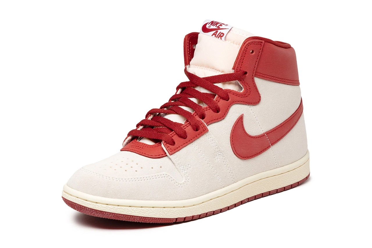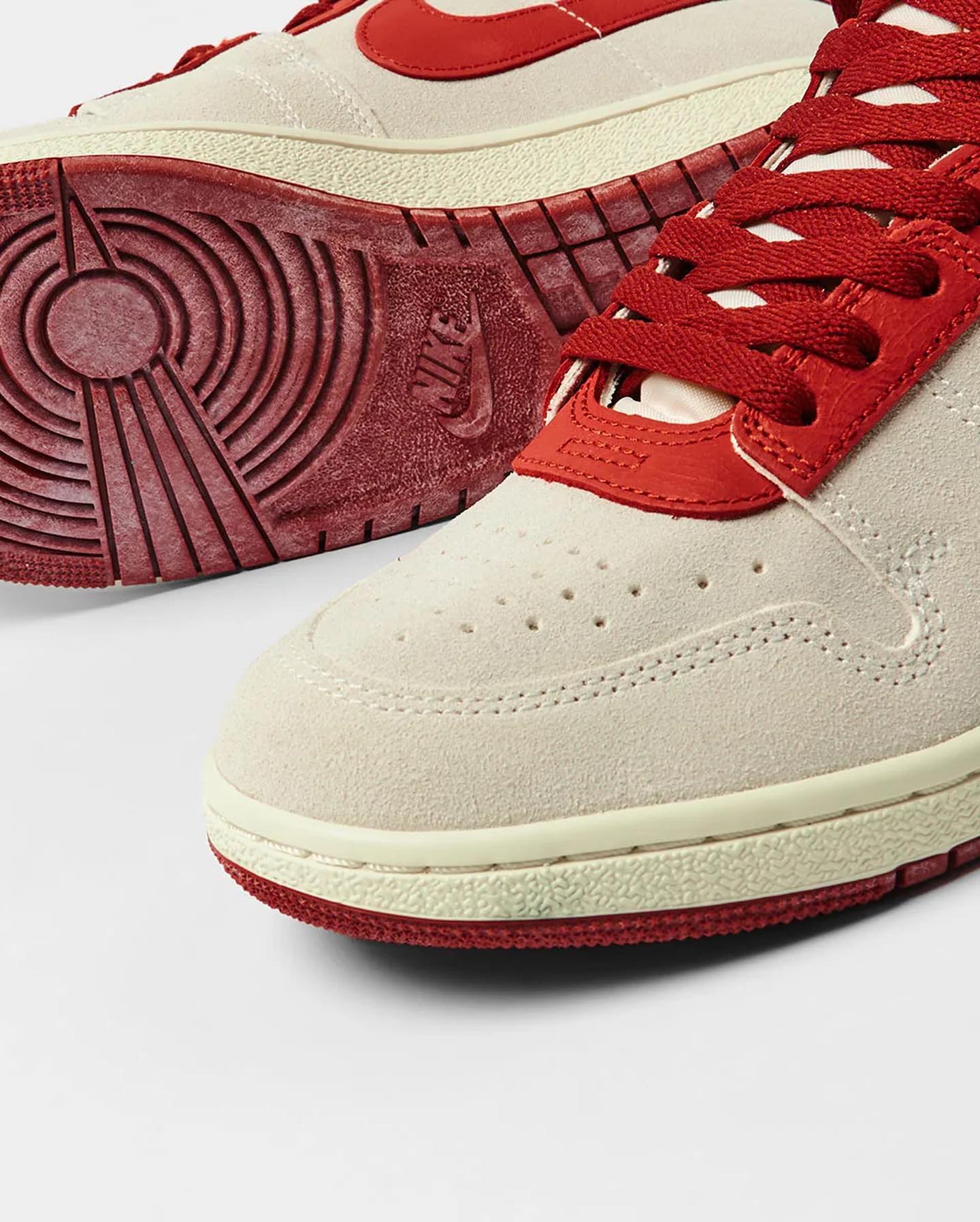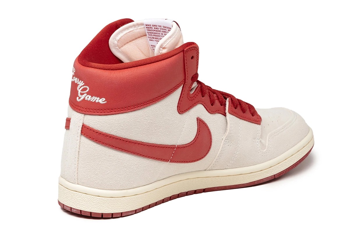 首先来看第一双,整双鞋采用带有做旧风格的乳白色为主调,辅以经典红色点缀,灵感来源于 “公牛主场短裤”。
