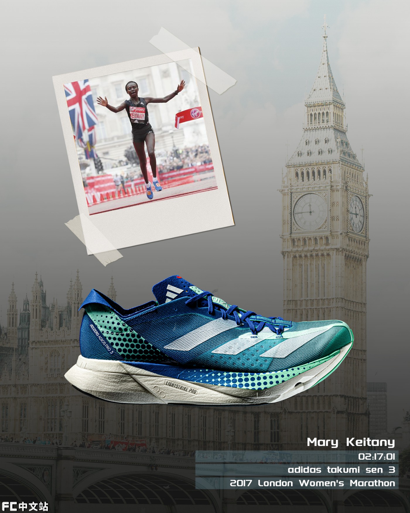 第三双则是致敬 2017 年伦敦马拉松比赛的冠军 Mary Keitany,她在当时以 2 小时 17 分 01 秒的成绩斩获了创造了当时新的世界纪录。