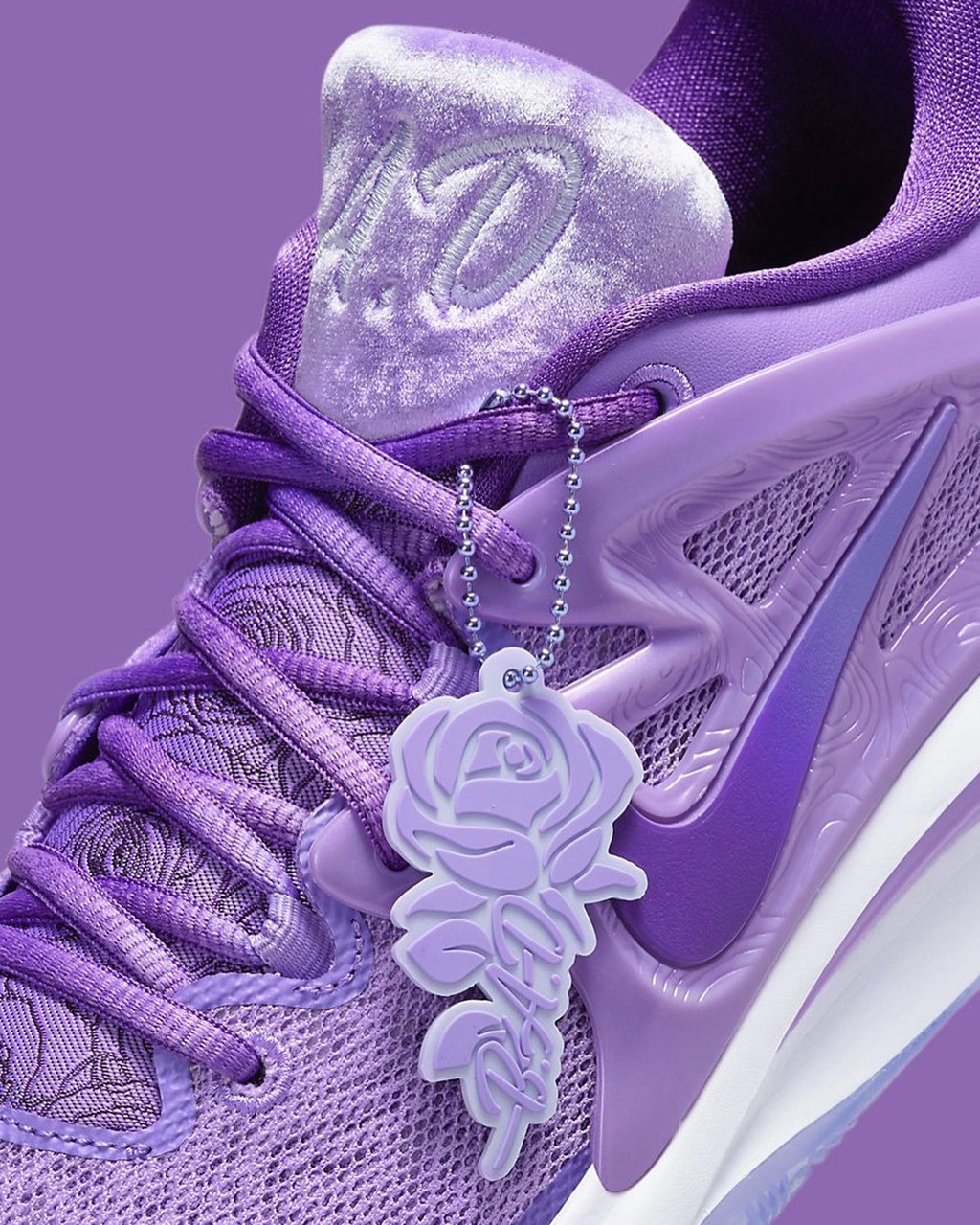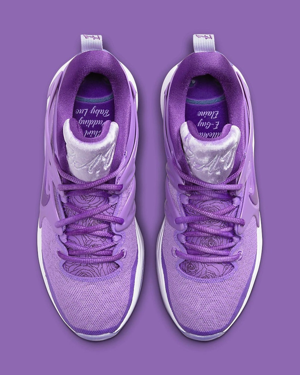 细节方面,鞋舌采用天鹅绒材质打造,并写有杜兰特姥姥的名字缩写,下方则是满印的玫瑰线条。