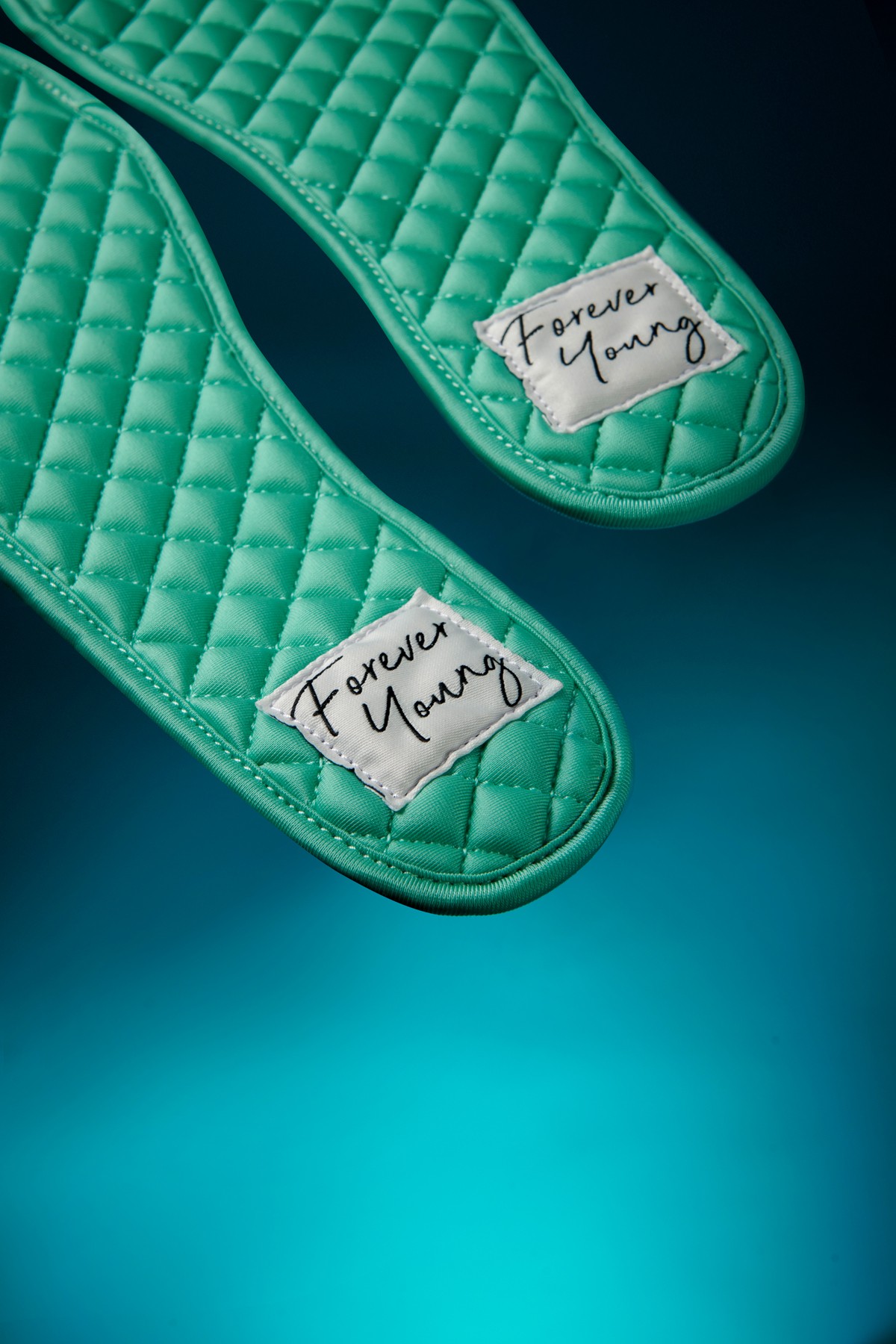 薄荷蓝色的鞋垫,采用十分奢华的棱形格设计,并在后跟写有「Forever Young」字样,与鞋款形成呼应。