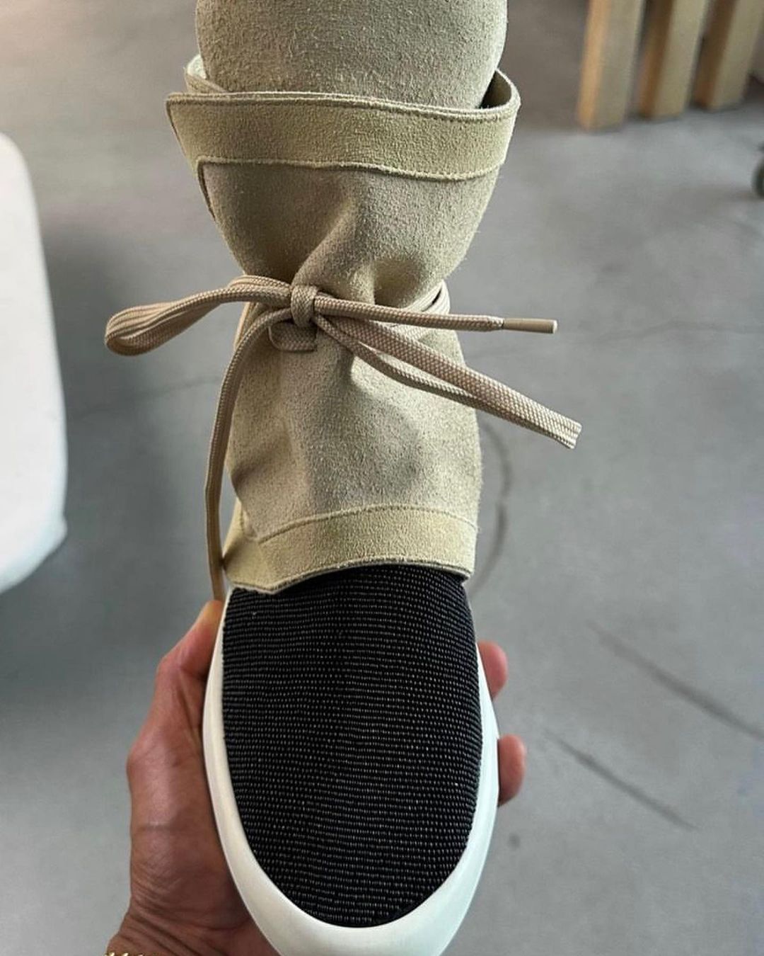 整体以超高帮军靴造型呈现,黑色与卡其色组成的鞋身更是将 FOG 的韵味彰显。