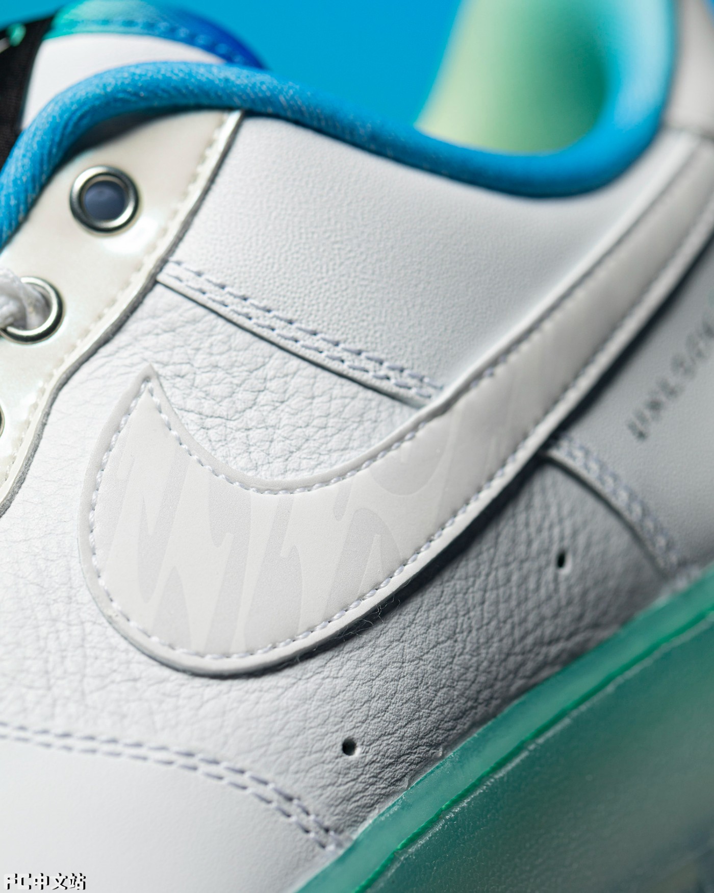 就连 Swoosh 都加入 3M 反光纹理,另外还能发现,其实鞋面也是两种不同纹理的皮革拼接而成,相当用心。