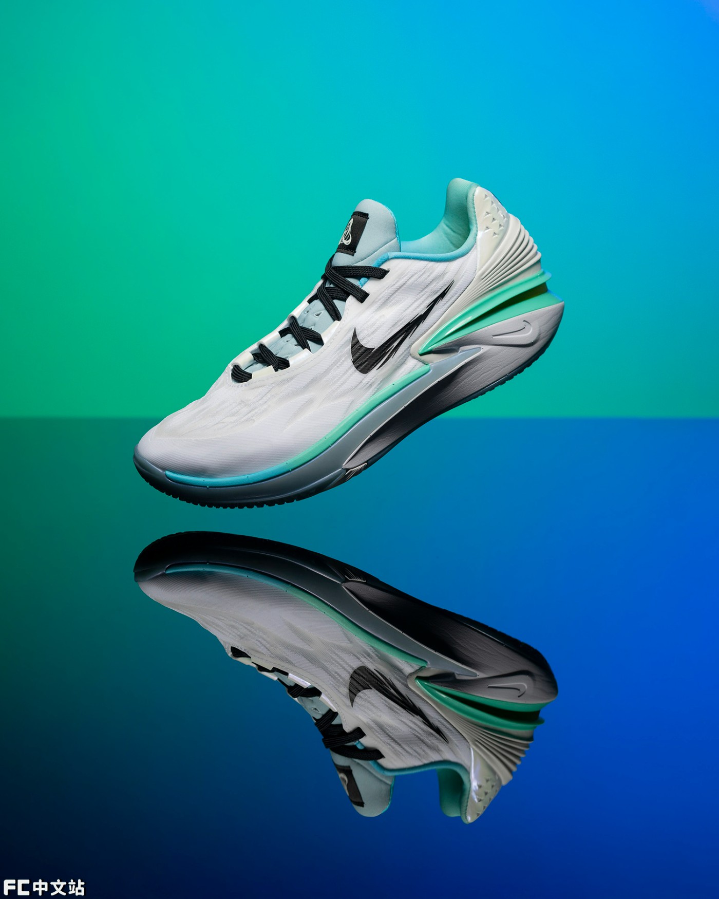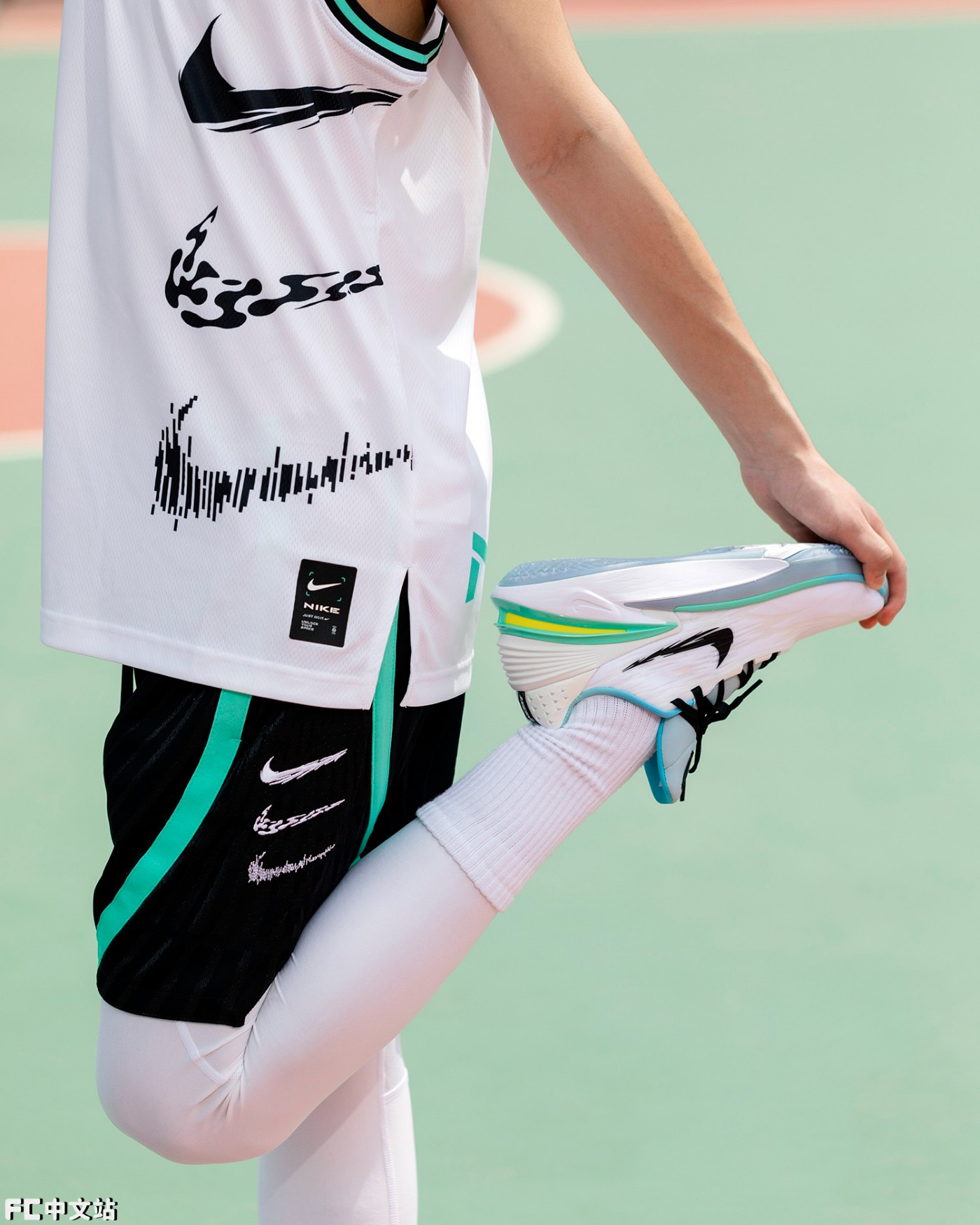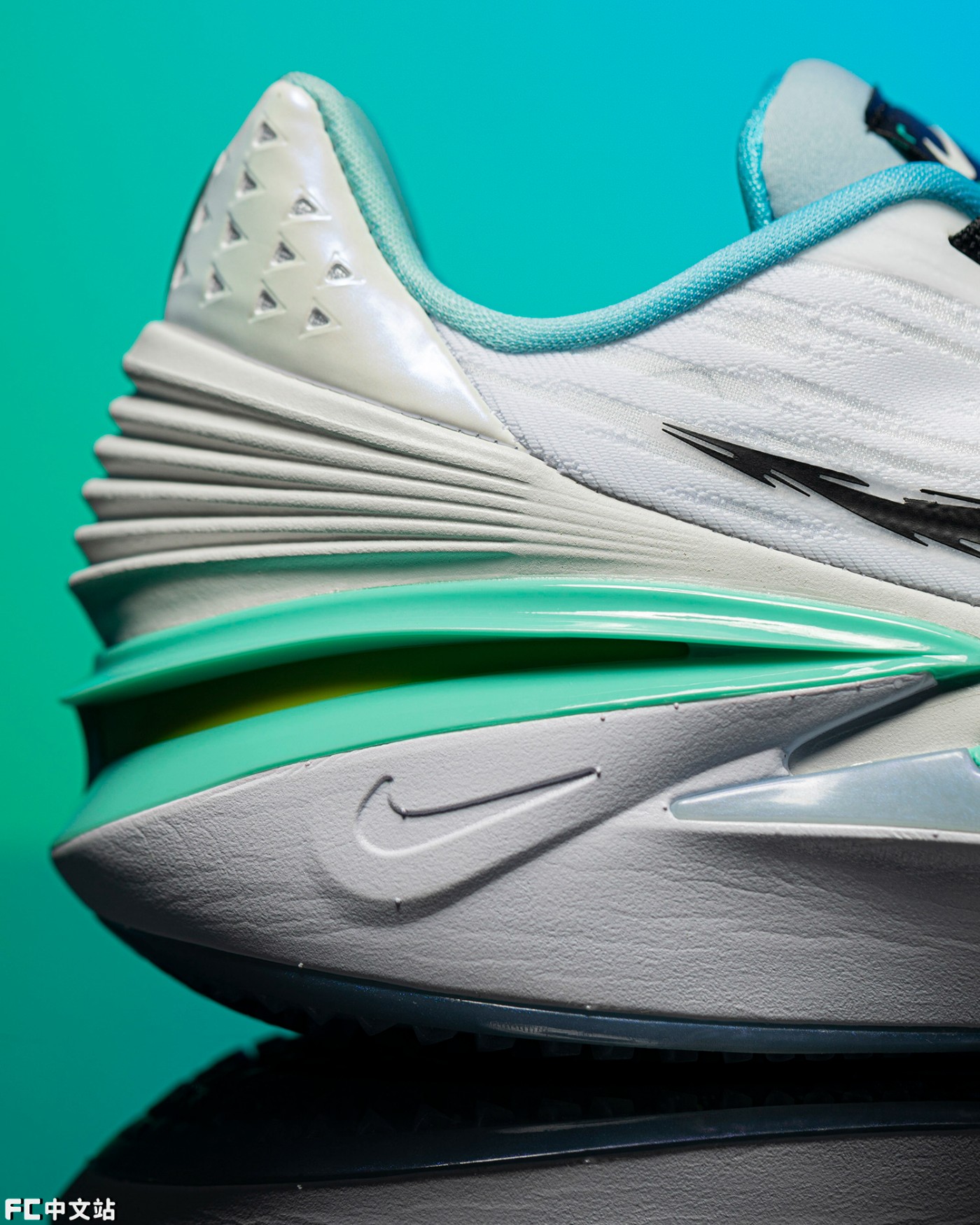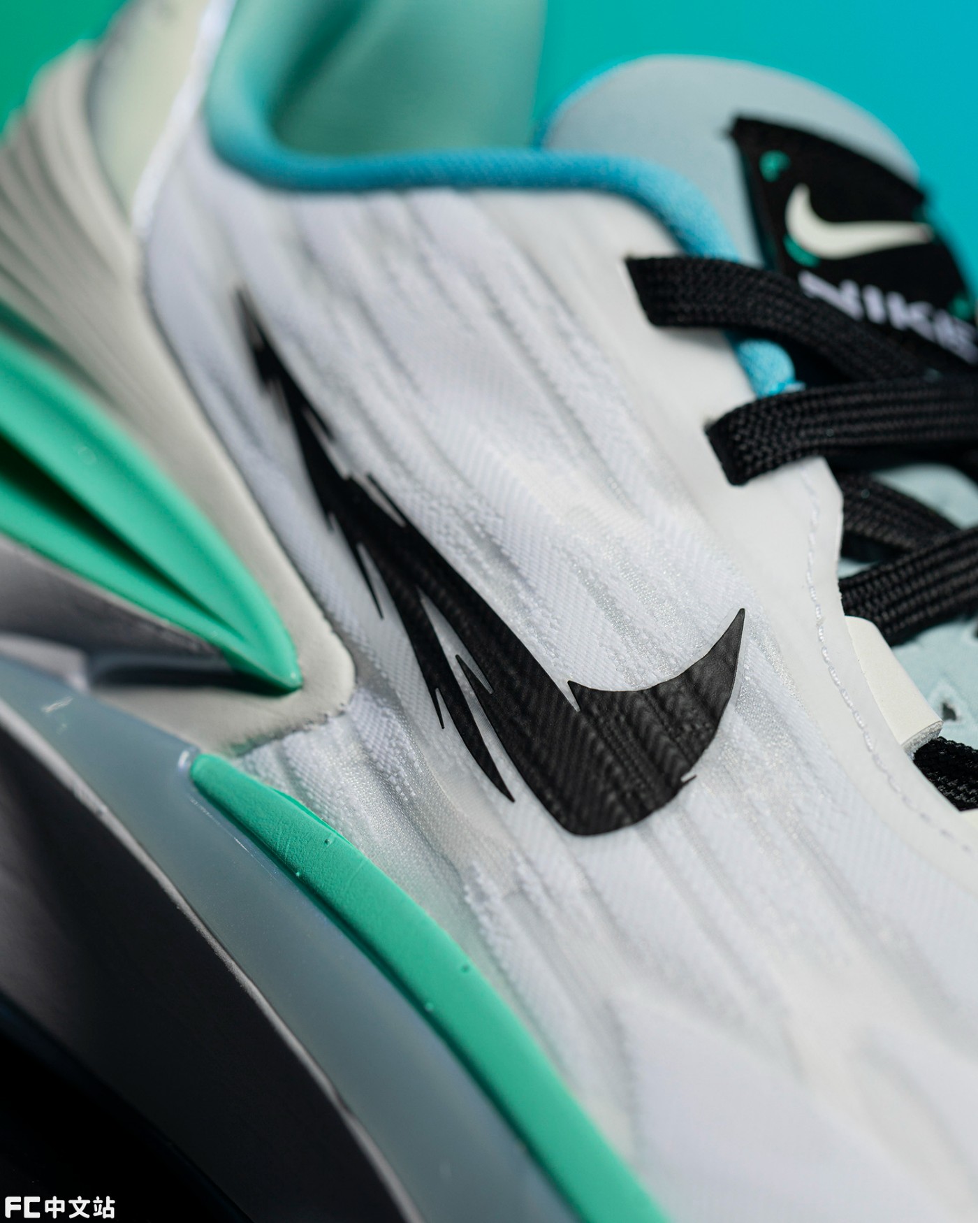 配色方面,为了强调年轻球员们的青春感,选择了清爽讨喜的蓝绿渐变,结合白色鞋面,夏日氛围简直拉满。