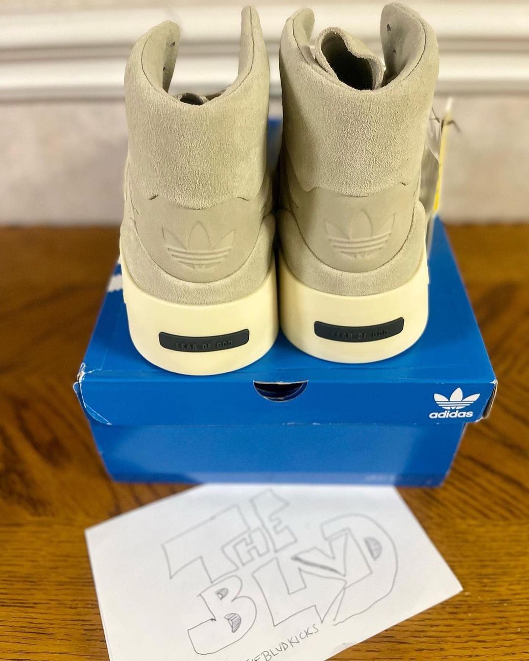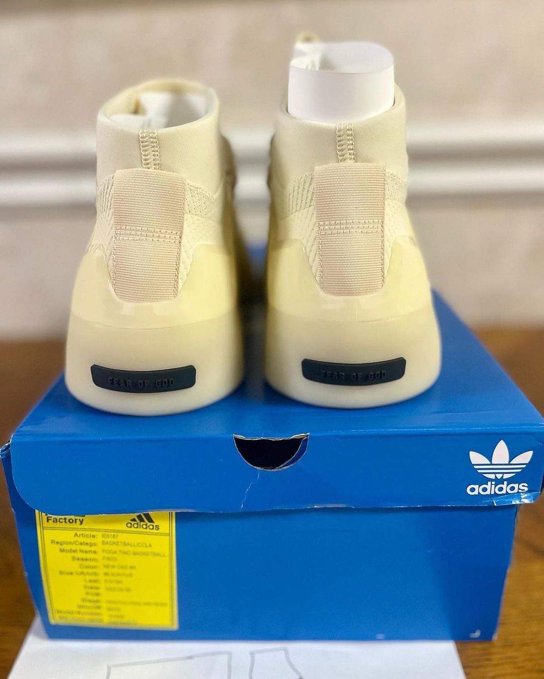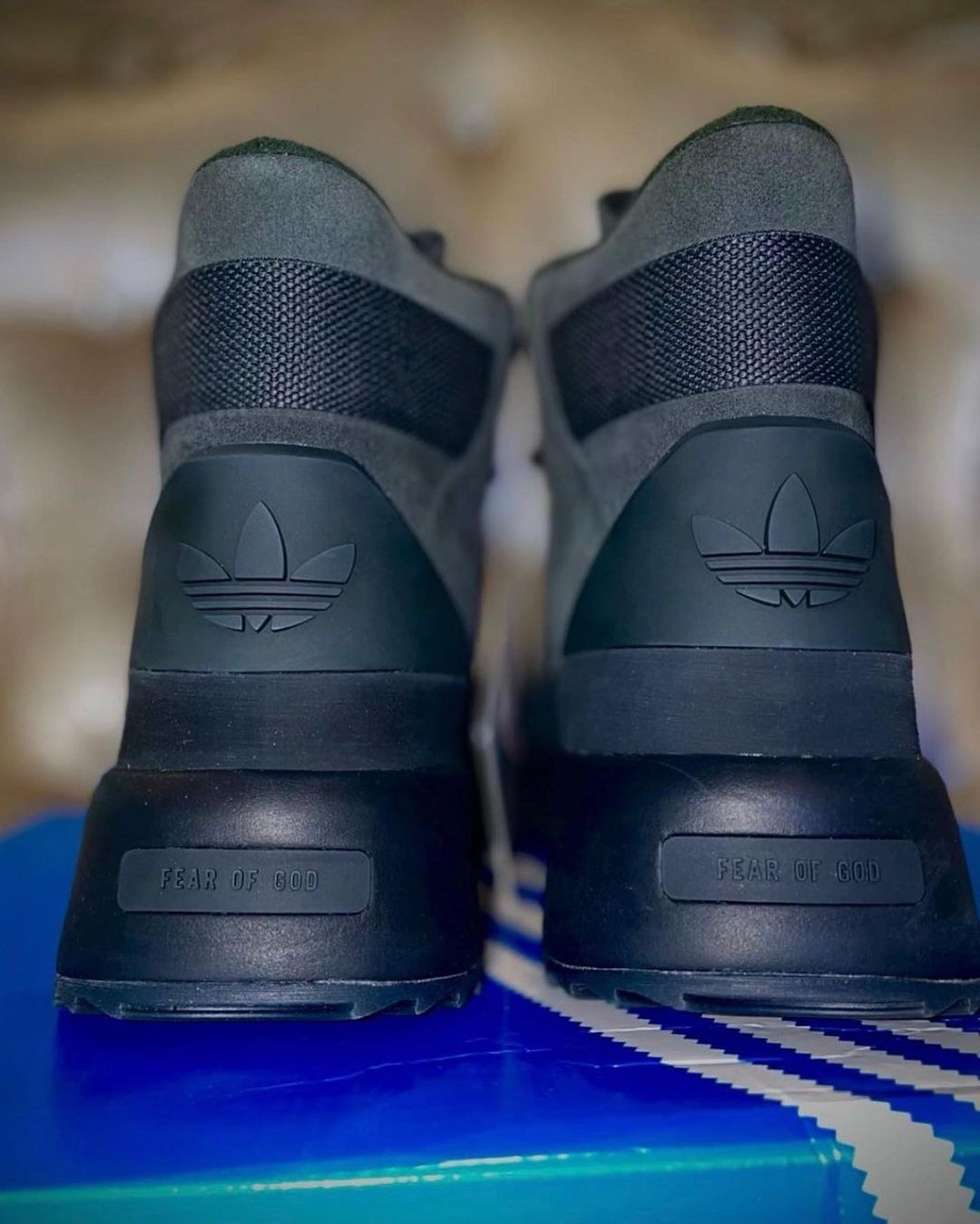 后跟位置分别压印 Fear of God、三叶草 Logo。
