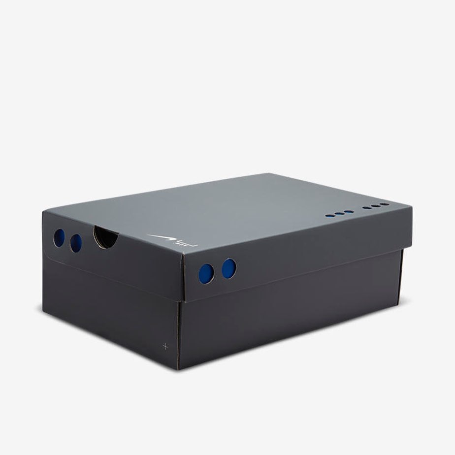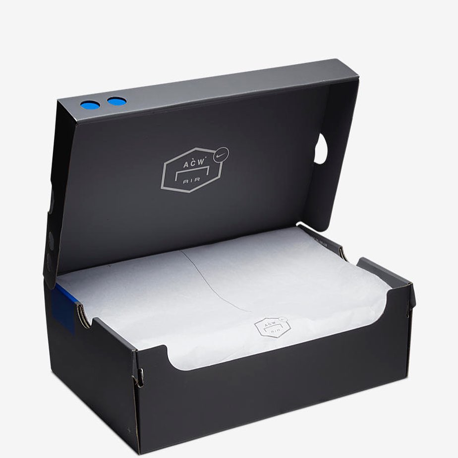 鞋盒也进行了重新设计,在水泥灰色的造型上,不仅加入了 ACW 与 Nike Logo,还添加了多个孔洞设计,可见联名诚意。