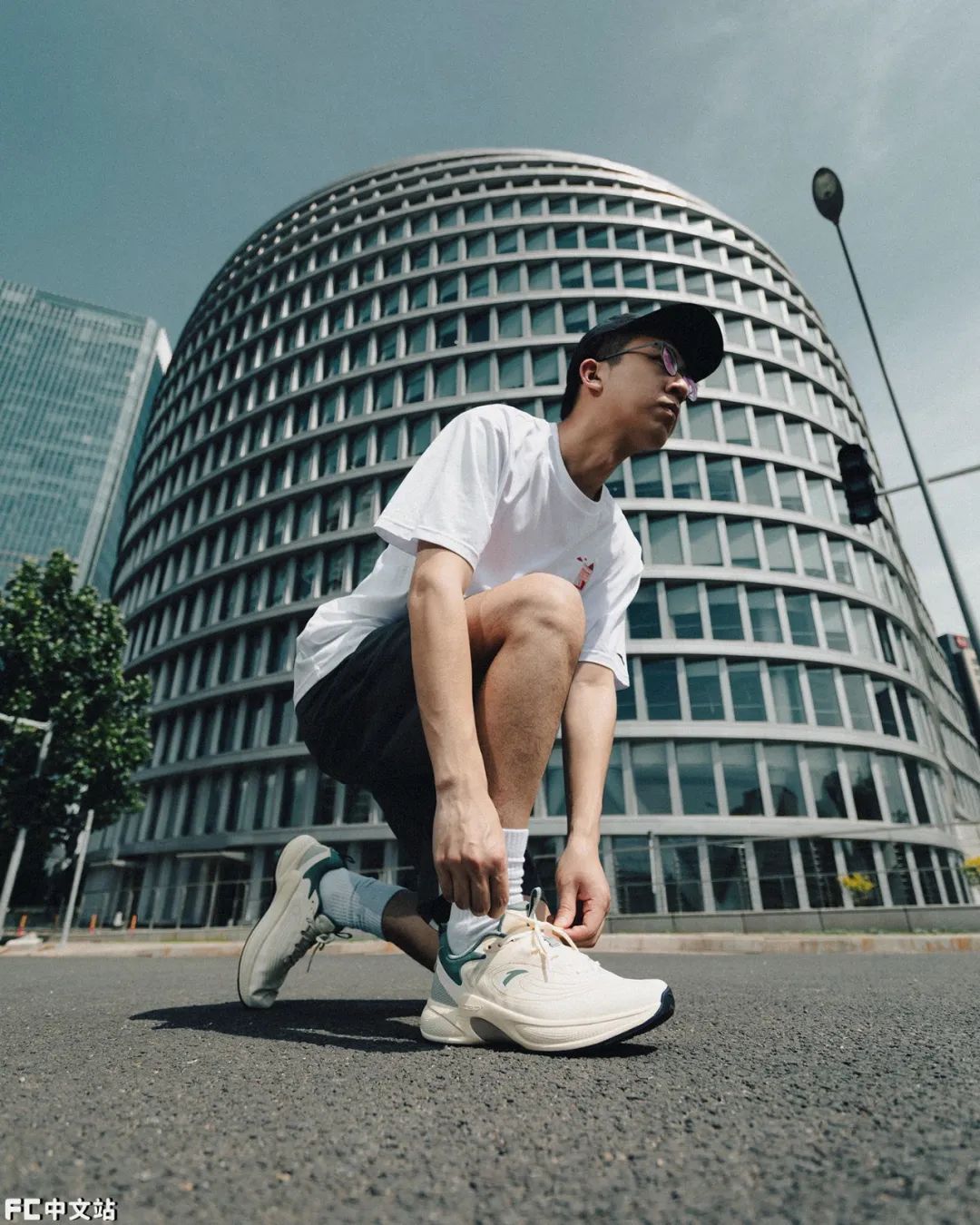 看着就凉快的青色装扮,搭配一条灰色运动短裤,让脚上的鞋子完整展现。