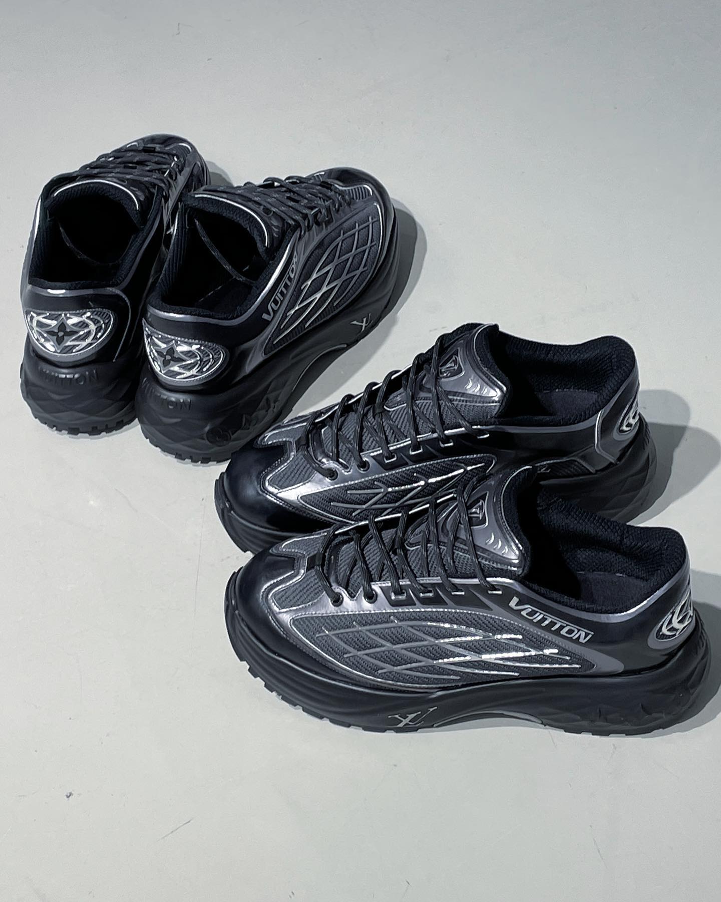 鞋面采用光感十足的漆皮包裹,外底的设计略带轮胎感,再加上 Louis Vuitton Logo 的妆点,将尊贵属性表现得淋漓尽致。
